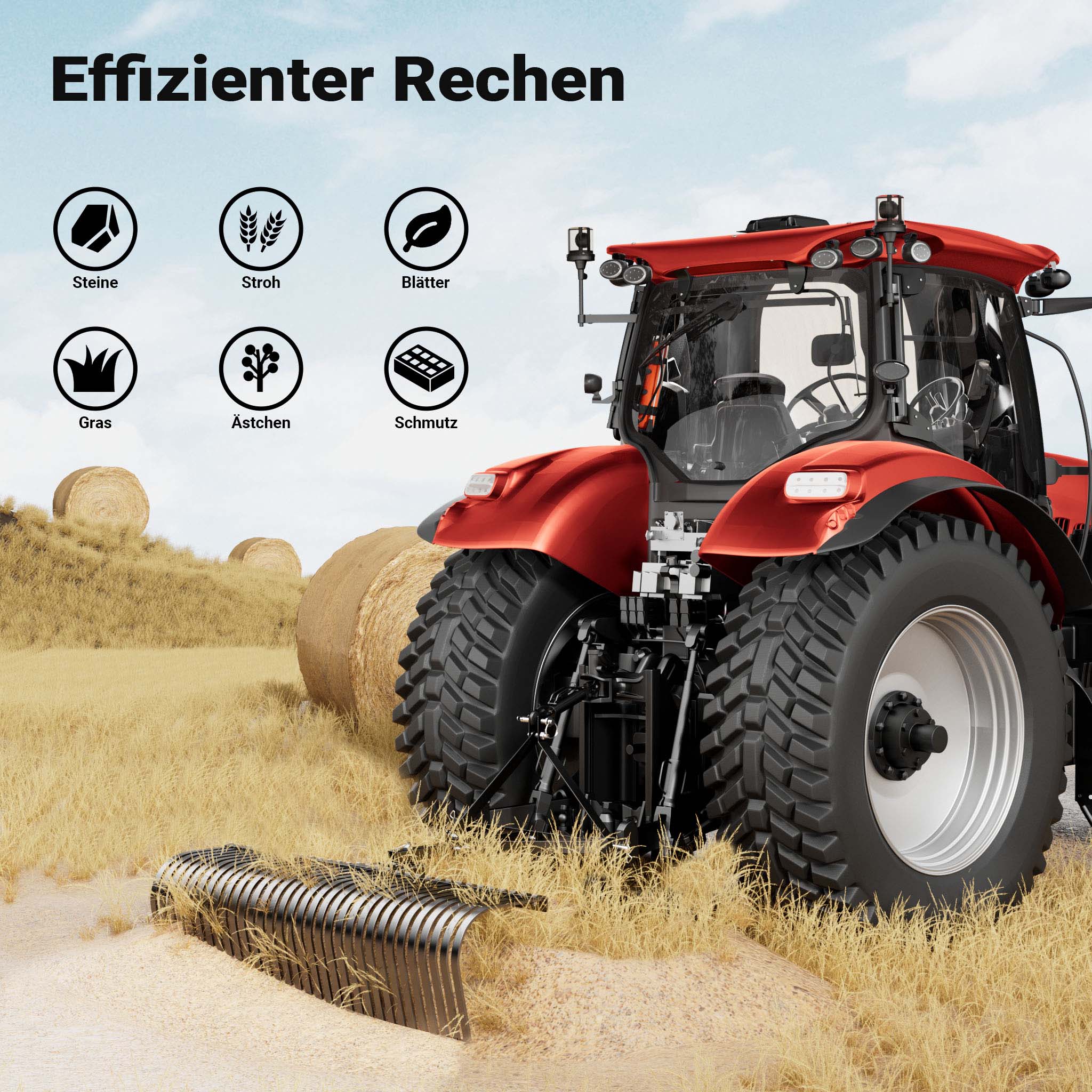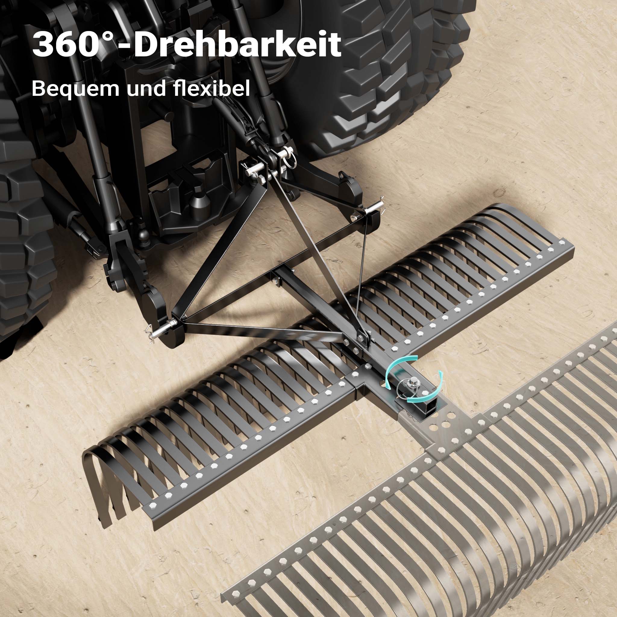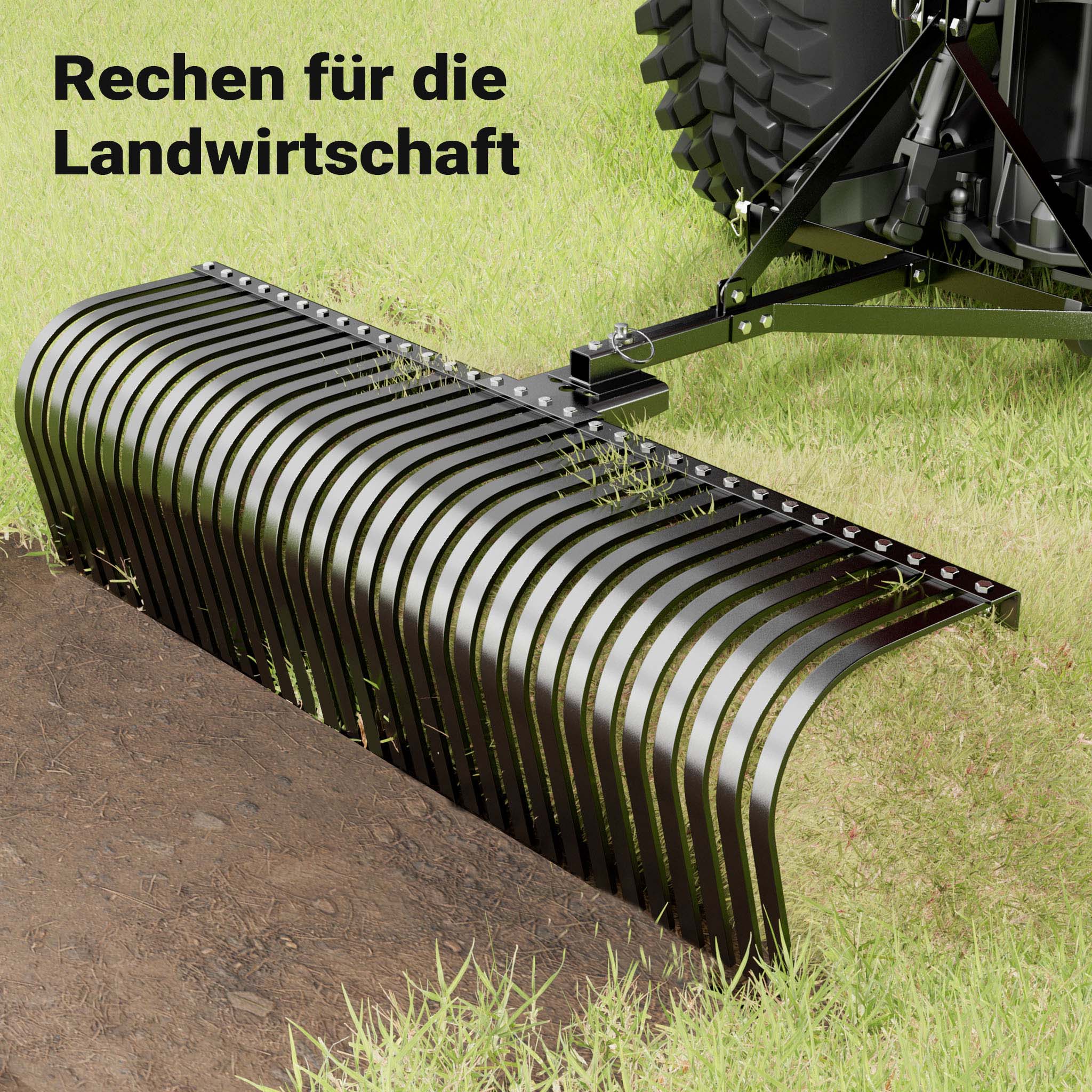 Il rastrello per mini trattore non è solo efficace nella lavorazione del terreno, ma può fungere anche da rastrello raccogli sassi o fieno. Dotato di un sistema di attacco a 3 punti, offre una grande flessibilità e un fissaggio sicuro non solo ai trattori compatti, ma anche ad altri attrezzi da giardino, come i trattorini da prato. La funzione di rotazione a 360° consente di girare il fieno in qualsiasi direzione, facilitando la distribuzione uniforme e rendendo la fienagione più confortevole e meno faticosa.