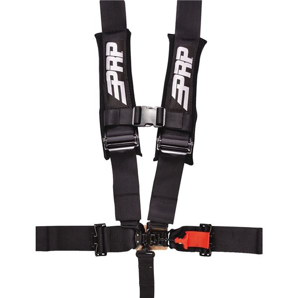 PRP Seats UTV Racing Harnesses have sewn in pads for comfort, all black hardware for cool styling and EZ adjusters on the shoulders. The EZ Adjusters fix a problem that has been an issue with off road seat belts for years. Once a belt gets some dirt and water in the webbing they become very difficult to adjust, but these quick adjusters will always provide a quick, easy to use seat belt. The seat belt also has a removable sternum strap, and a red latch guard on the lap belt. The lap belt bolts in while the shoulder harness and crotch strap can either bolt down or wrap around a roll bar.