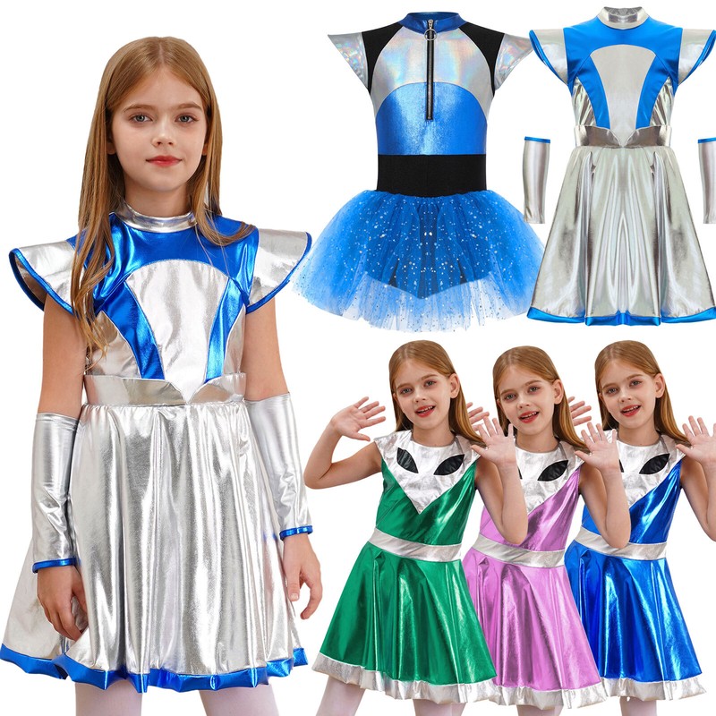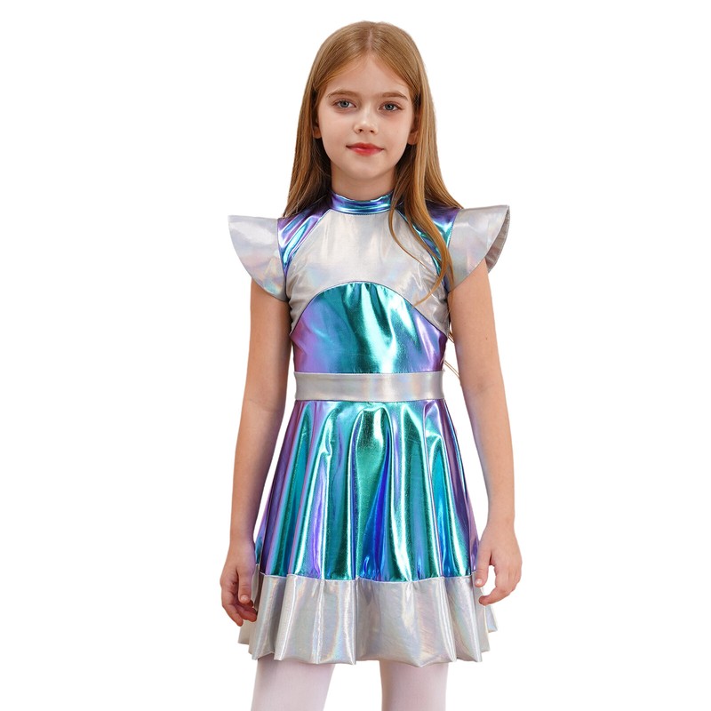 Girls alien costume is designed with mock neck, fly sleeve and front zipper.