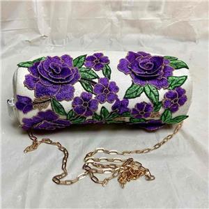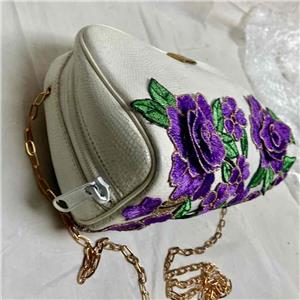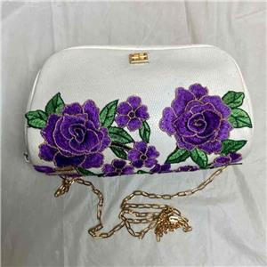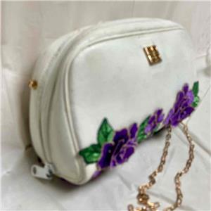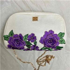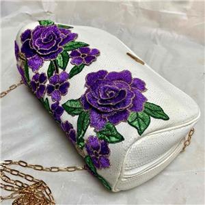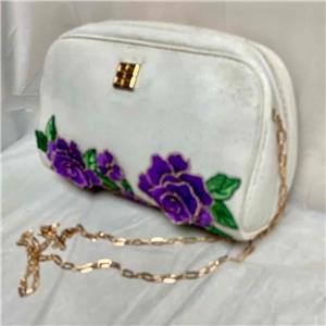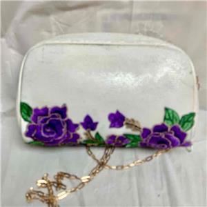 This is a rare, vintage, pre-owned, small white carry-on pouch with added 46-inch crossbody gold chain strap. It measures 8.5 inches long, 5 inches high and about 3 inches wide. The exterior of this pouch has roughness and some areas were covered with purple floral embellishments. The original leather crossbody strap was replaced with gold crossbody chain. Overall it is in good condition as shown in photos. Please supersize photos for condition details. Package weight is 2-3 pounds.