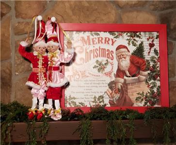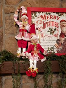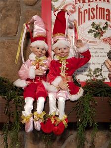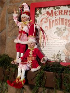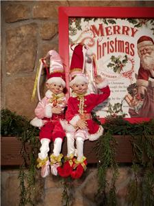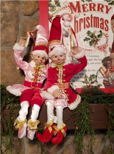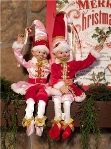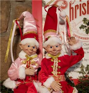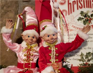 This is a set of 2 new with tag 16" pose-able Pink & Red attire Santa's Elf Christmas Decorations from RAZ Imports.