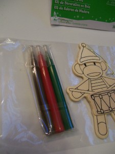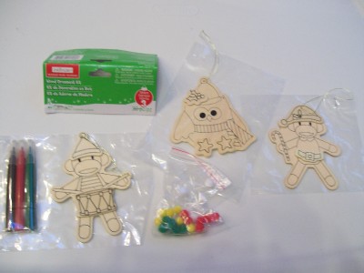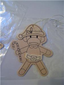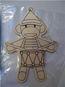 This is a New in package set of 3 natural Wood "ready to paint" Sock Monkey & Owl Christmas Ornaments.