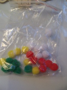 Each set comes with 3 colored markers. This set comes with green, red and brown. You can also use your own colored markers or paints if you choose. It also comes with small Pom-pom's that can be glued on. (glue not included)