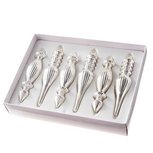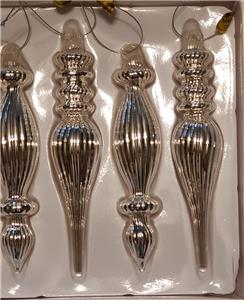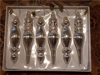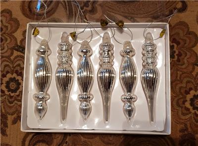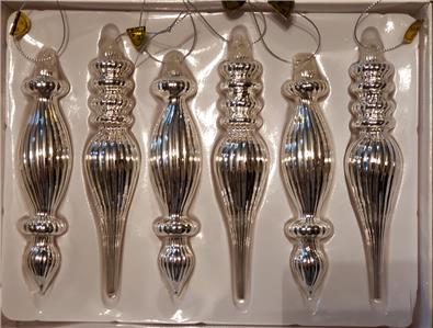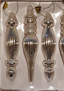 This listing is for a set of 6 new in box Style #B, SILVER Mercury Lined Glass Christmas Finial Ornaments with ribbed detail from RAZ Imports.