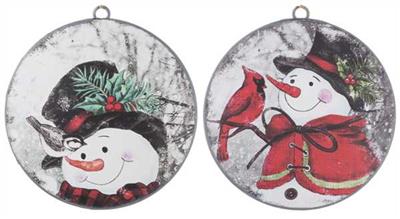 This listing is for the set of two, 6" diameter metal DISC ornaments with colored black and white Snowman Winter scenes