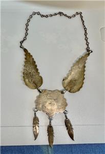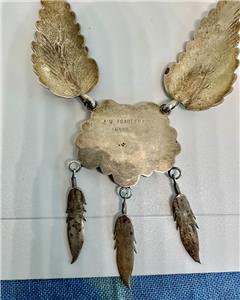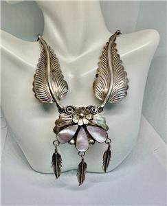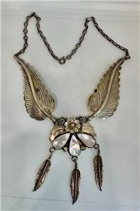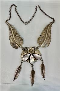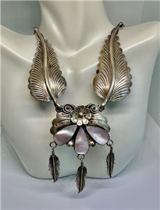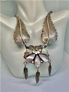THIS IS A MAGNIFICENT NECKLACE BY RENOWNED NAVAJO NATIVE AMERICAN ARTIST JAMES W. TOADLENA IN STERLING SILVER WITH MOTHER OF PEARL IN A FEATHER, FLOWER AND LEAF MOTIF.