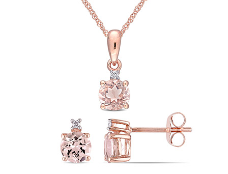 Add classic elegance and romance to everyday looks with this exceptional Morganite and Diamond Two Pc Drop Pendant with Chain and Earrings Set. Crafted in sparkling rose gold, this queenly pendant and earrings set features three round cut, prong set, morganite gemstones (5 x 5mm) at the center embedded by three round cut, prong set glossy diamonds (G H, I2-I3) elegantly beaded above the stone to add a sparkle to the eye. This pendant is suspended on a 17-inch rope chain and earrings are secured with butterfly closures. Enhanced with a high polish finish, this stunning set will be a symbol of your eternal love and bond.