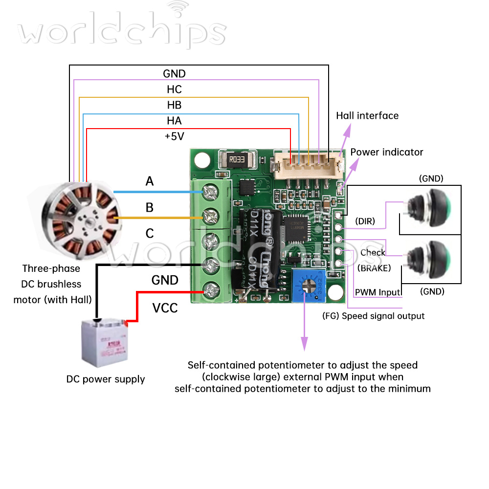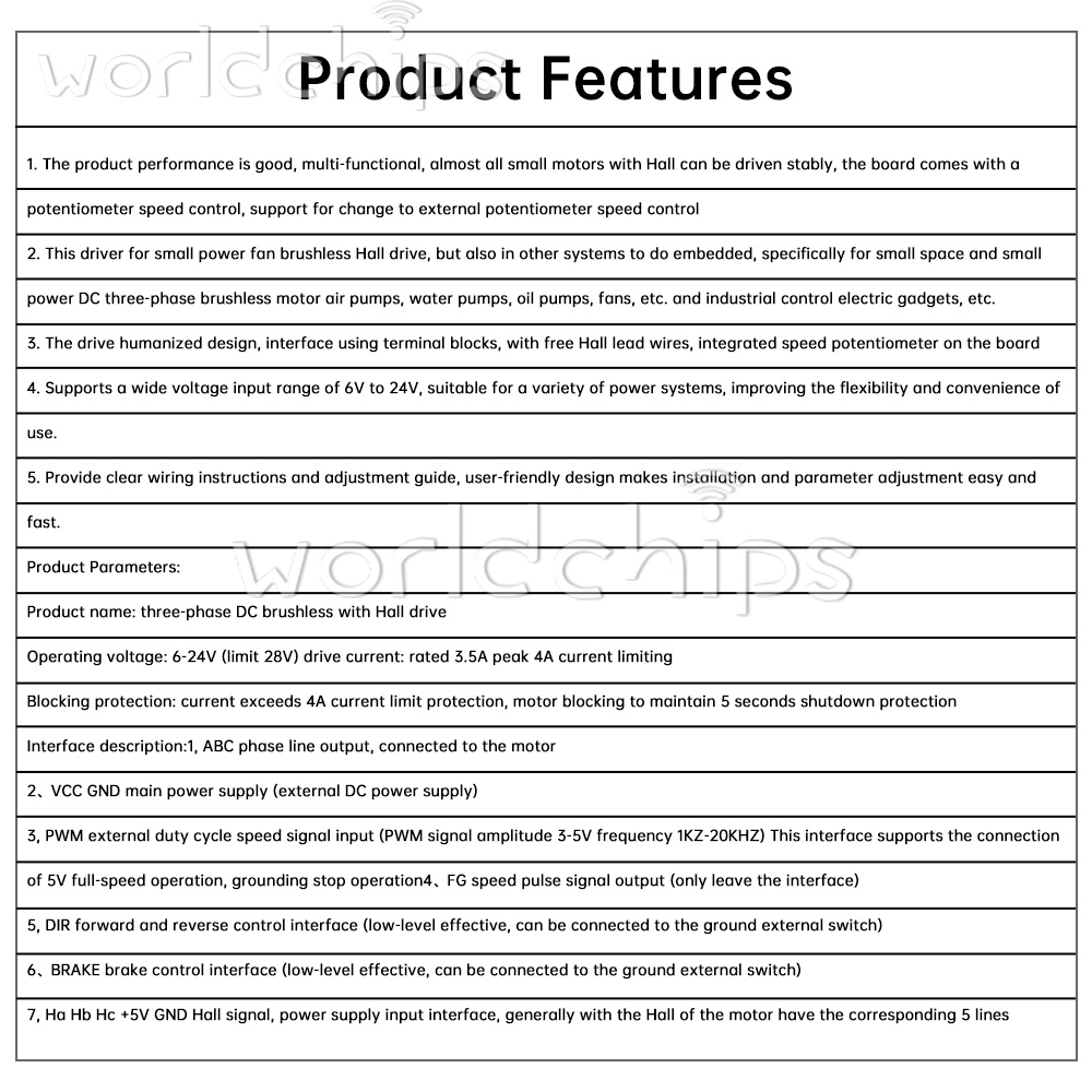 1. Product performance is good, multi-functional, almost all small motors with Hall can be driven stably, the board comes with a potentiometer speed control, support for change to external potentiometer speed control