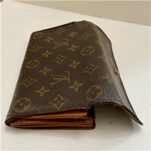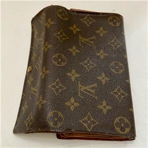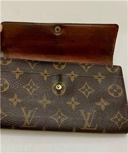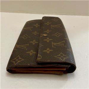 This is a pre-owned bi-fold, long wallet made of brown mono coated canvas. This wallet has a slots for bills, IDs and Credit cards. Also, it has a zip pocket for coins or keys. Folded it measures about 7.5 inches long and 4inches wide. It has a replaced zipper pull, edge wear on folded areas, soiling and discoloration as shown in photos. Date code: TH1805- Made in Spain, October 1985.