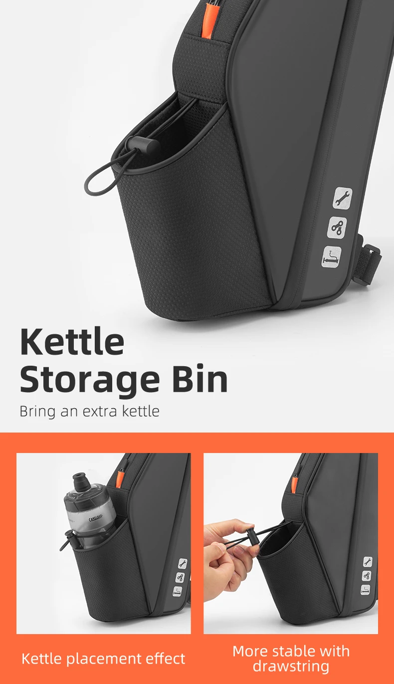 Il ne mesure que 7 cm de large, similaire à la largeur du tube supérieur, il ne touche donc pas vos jambes lorsque vous roulez, vous offrant ainsi une expérience de cyclisme plus confortable. En même temps, vous pouvez transporter votre bouteille dans le sac pour bouteille d'eau.