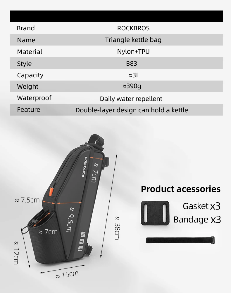 La chambre supérieure a un volume d'environ 2 l et la chambre inférieure d'environ 1 l. Vous pouvez y mettre de nombreux articles pour répondre à vos besoins quotidiens en vélo. De plus, la grande ouverture en forme de « V » vous permet de mieux voir les articles et de les sortir et de les mettre plus facilement.