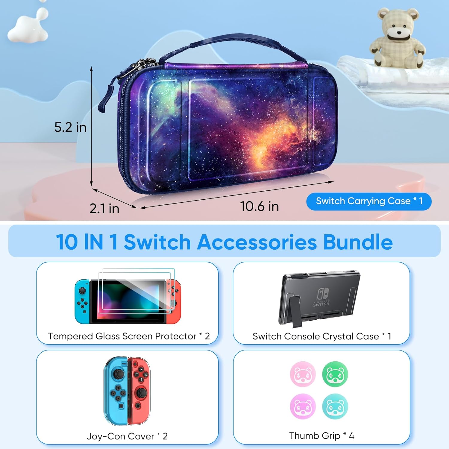 【10 in 1 Switch Accessories】 This Switch accessories bundle includes: Switch carrying case x 1, Switch 2017 6.2-inch tempered glass screen protectors x 2, Switch 2017 Console clear soft TPU case x 1, Joy-Con clear soft TPU cover x 2, Joy-Con thumb grips x 4. Meet all your basic needs for Switch accessories.
