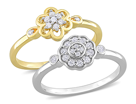 Celebrate timeless elegance with this 2-piece set of 3/10ct TDW Diamond Flower Rings. Crafted in a stunning combination of yellow and sterling silver, these rings are adorned with dazzling diamonds in a delicate floral design. Perfect for adding a touch of sparkle to any occasion, this set is both sophisticated and stylish. A beautiful way to symbolize love, beauty, and grace.