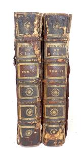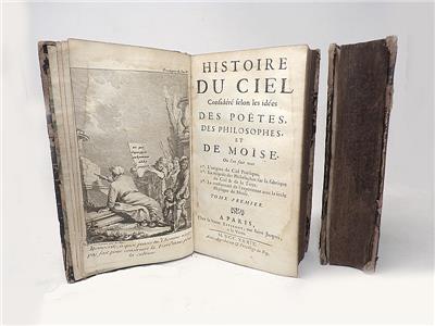Histoire Du Ciel Considéré selon Les idées Des Poëtes Des Philosophes, et De Moise. Two volumes. No author cited, but written by the abbe Pluche. Published by Chez la Veuve Estienne, Paris, in 1739. First edition, 18mo, full leather. Volume I heavily illustrated. The text blocks are mildly toned, otherwise very good for their ages, with very light signs of water damage around the perimeters of the leaves of volume I. Volume two cleaner. Full leather bindings are intact, but in very poor shape.