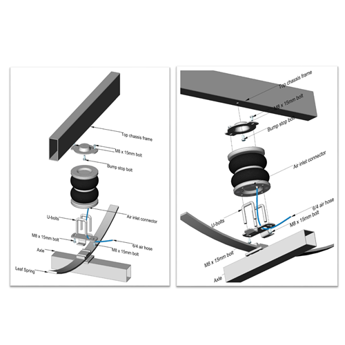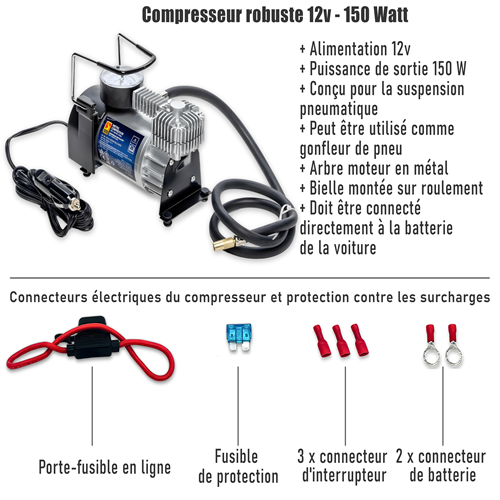 The included 12V compressor is versatile, usable for tire inflation in emergencies. With a 5000 kg load capacity, this kit is ideal for commercial and leisure vehicles, provided with detailed instructions, galvanized mounts, and all necessary accessories for a quick, straightforward installation.