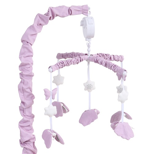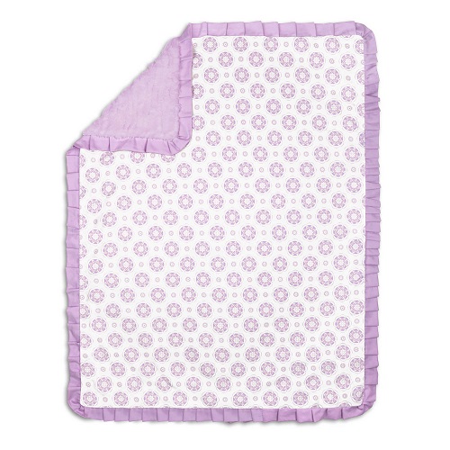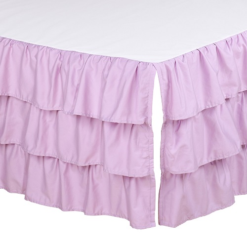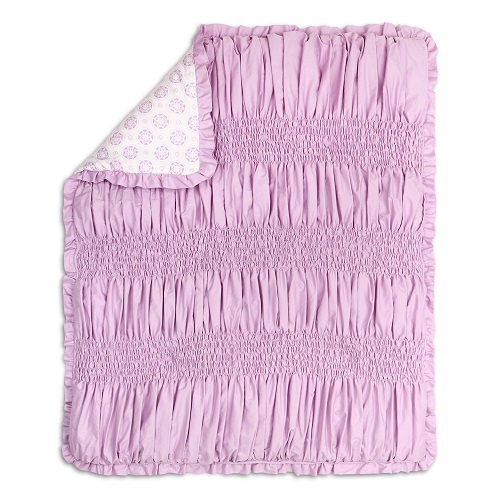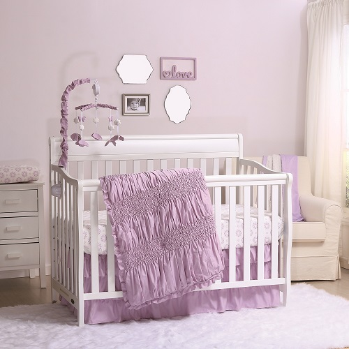Create a sweet and delicate nursery for your new arrival with The Lilac Kisses 3-Piece Crib Bedding Collection from The Peanut Shell. Dressmaker's technique of smocking is used to beautifully create a linear pattern across the lilac cotton sateen quilt. The three-layer dust ruffle adds a touch of feminine elegance without being fussy. A cotton sateen fitted sheet in silver metallic confetti dot completes the look. Compete this bedding set with a Crib Mobile. The bedding set consist of:
