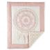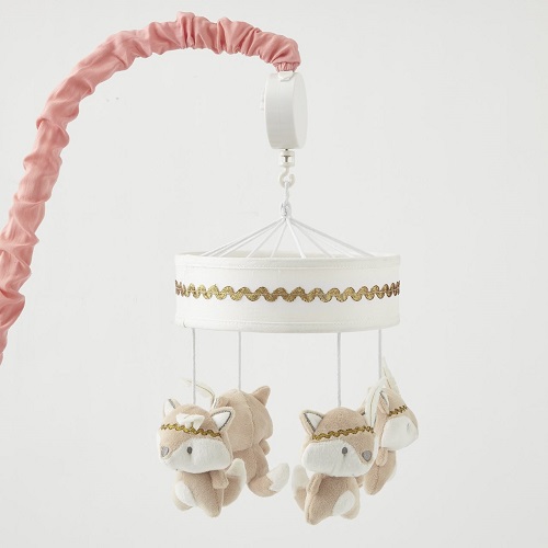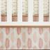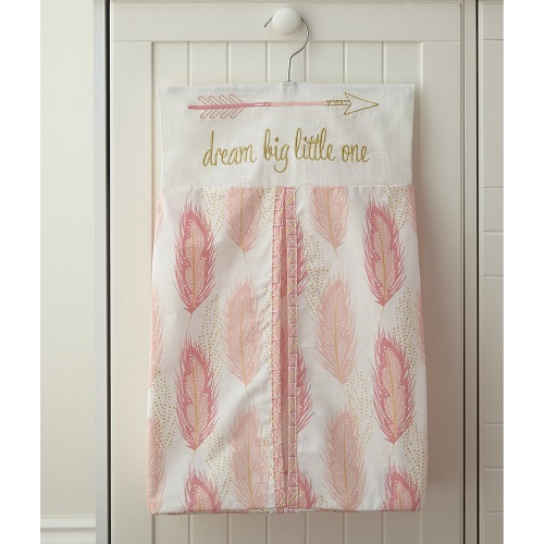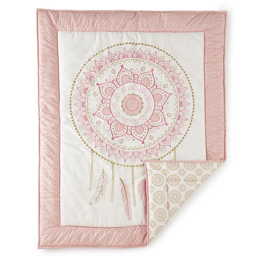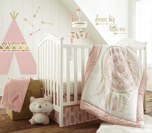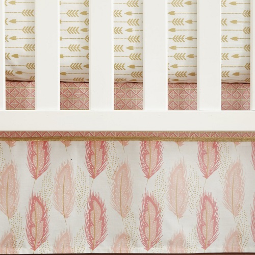 Levtex Baby Little Feather Coral Six-Piece Crib Bedding Set. The Little Feather Pink nursery set features an appliqued and embroidered dreamcatcher in beautiful pink with gold accents with a geometric print border and a medallion cotton print in gold and pink on the back. The set includes 5 beautifully coordinated and complementary pieces, consisting of a quilt, a 100% cotton fitted sheet, a tailored dust ruffle with gold ribbon trim, a diaper stacker and a large decorative wall decal. The decal set allows you to make your own fantastic wall mural. Complete the bedding set with a Musical Mobile. Bedding set consist of: