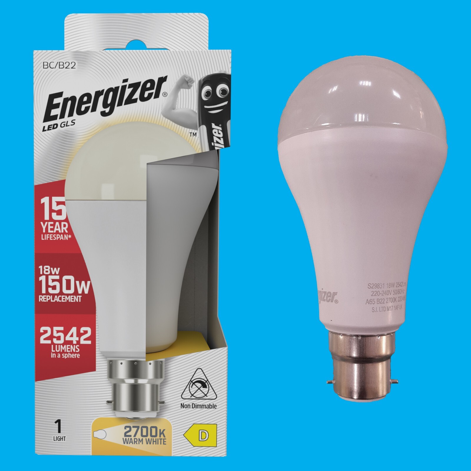 4x 18W (=150W) Energizer GLS BC B22 LED Light Bulb Lamp, 2700K Warm White 2542Lm