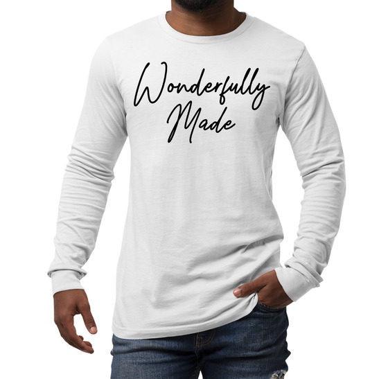 Mens Long Sleeve Graphic T-Shirt Wonderfully Made Black Illustration. Discover the versatility and style of this moisture wicking performance T-shirt. This unisex long sleeve t-shirt is designed to be a go-to choice in all seasons, whether it's the perfect fall shirt, a stylish option for spring, or a cozy companion in winter. Crafted from breathable fabric, it combines comfort and fashion effortlessly. Polyester, moisture-wicking fabric Double-needle topstitch detail Crewneck; ribbed collar; tubular body Regular fit; true to size Wash in cold water, hang dry or tumble dry low