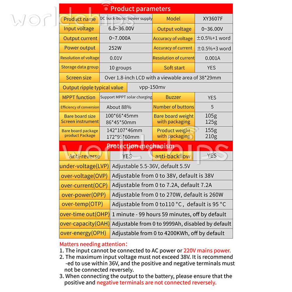 2. The maximum input voltage cannot exceed 38V, it is recommended to use it within 36V, and the positive and negative poles cannot be reversed.