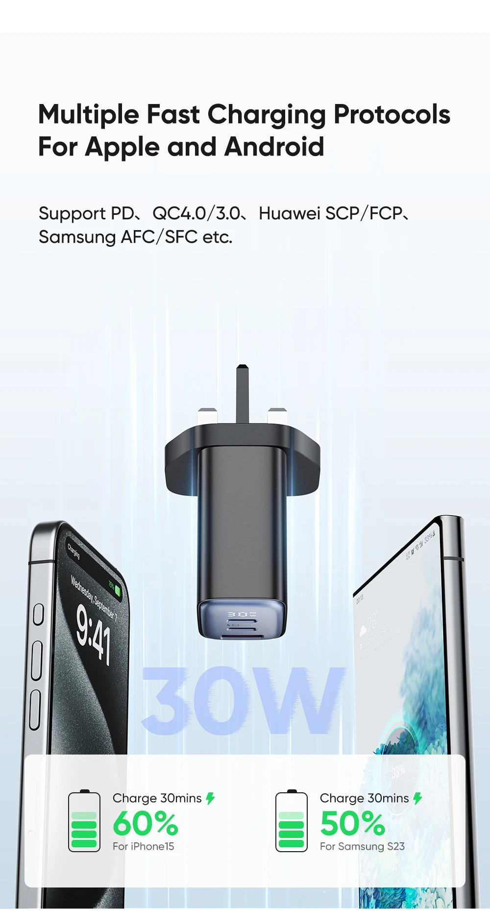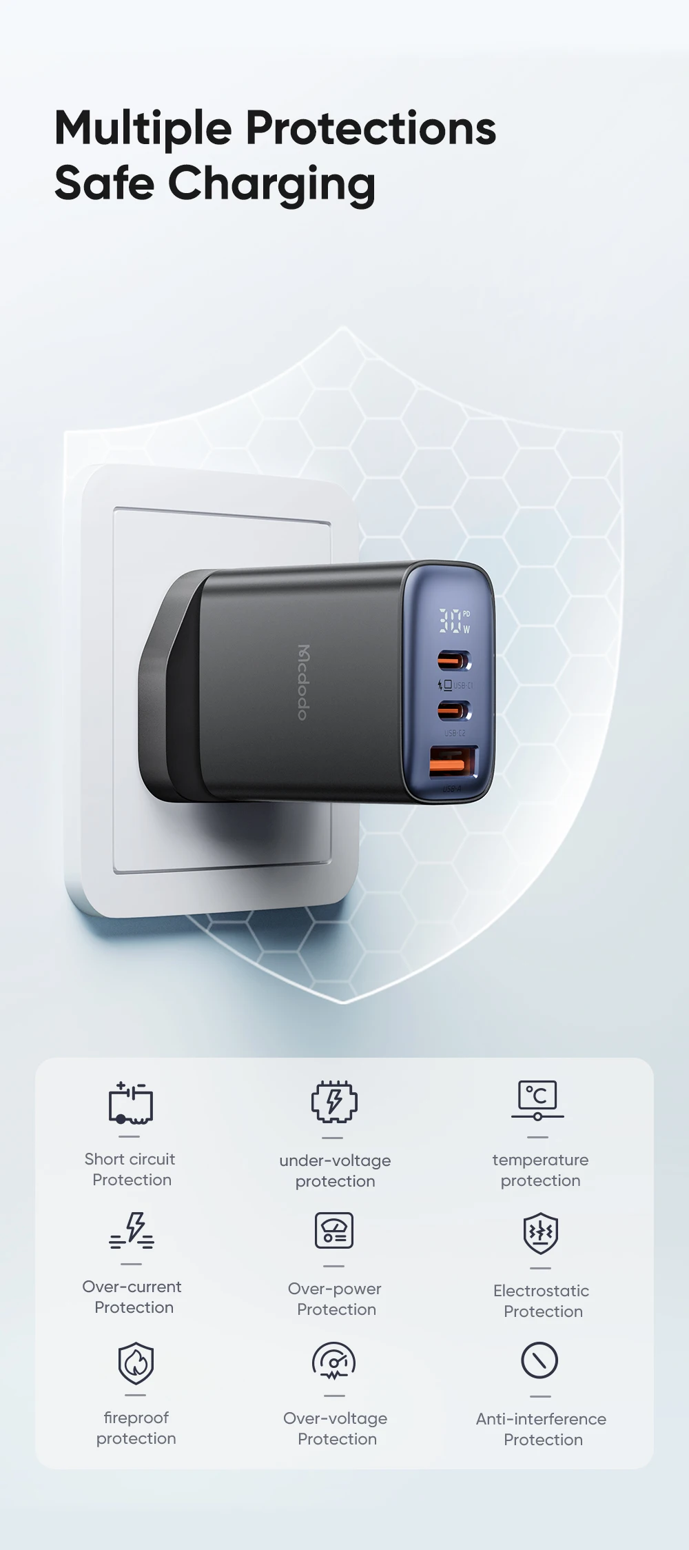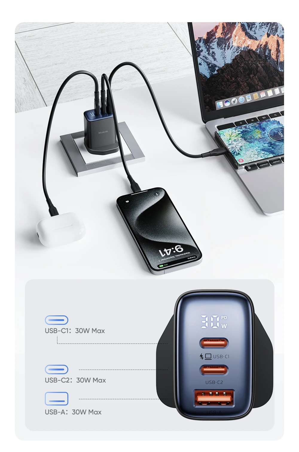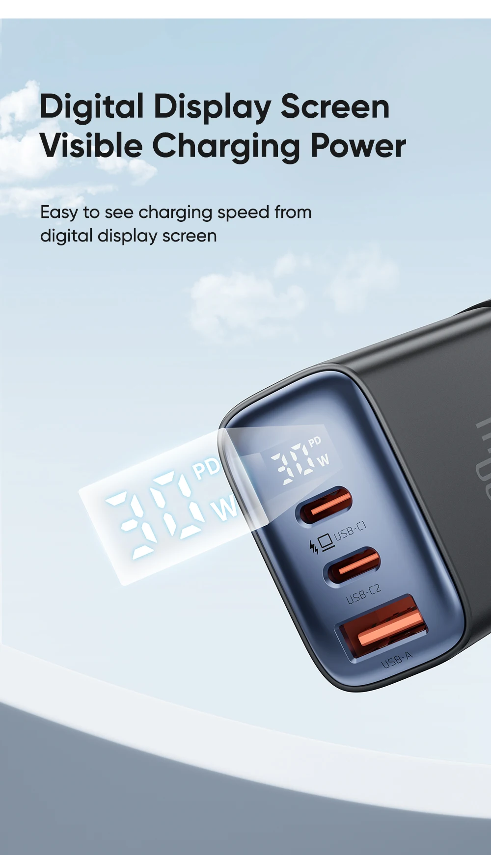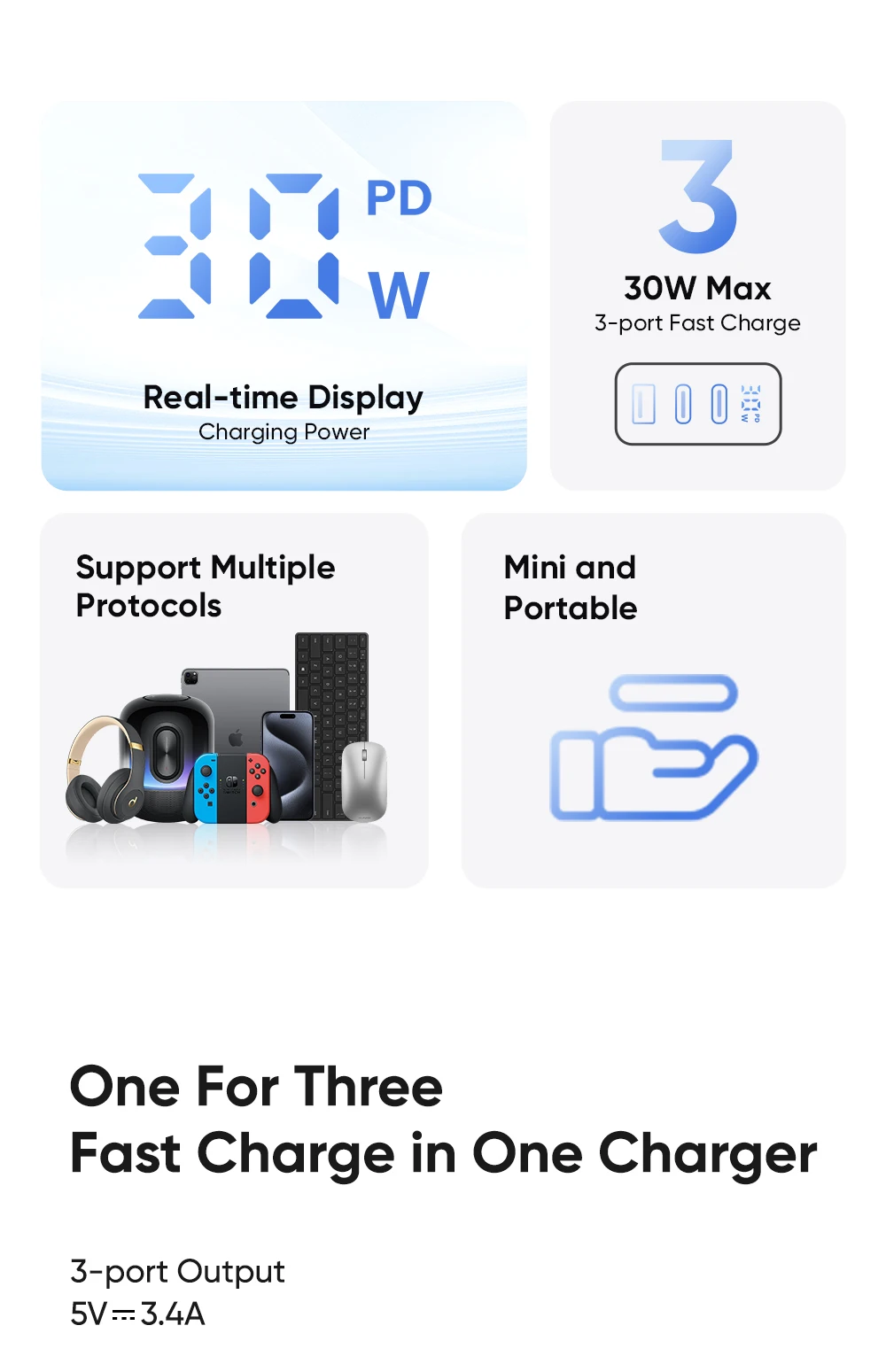 Features | 30W Max. 3-port Fast Charge Real-time Display Charging Power Support Multiple Protocols PD QC4.0 SCP FCP AFC SFC PPS etc. |
