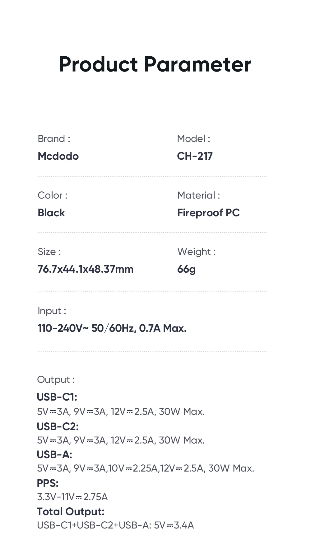 Ouput | Input: 110-240V~ 50/60Hz, 0.7A Max. Output: USB-C1: 5V⎓3A, 9V⎓3A, 12V⎓2.5A, 30W Max. USB-C2: 5V⎓3A, 9V⎓3A, 12V⎓2.5A, 30W Max. PPS: 3.3V-11V⎓2.75A USB-A: 5V⎓3A, 9V⎓3A,10V⎓2.25A,12V⎓2.5A, 30W Max. Total Output:USB-C1+USB-C2+USB-A: 5V⎓3.4A |