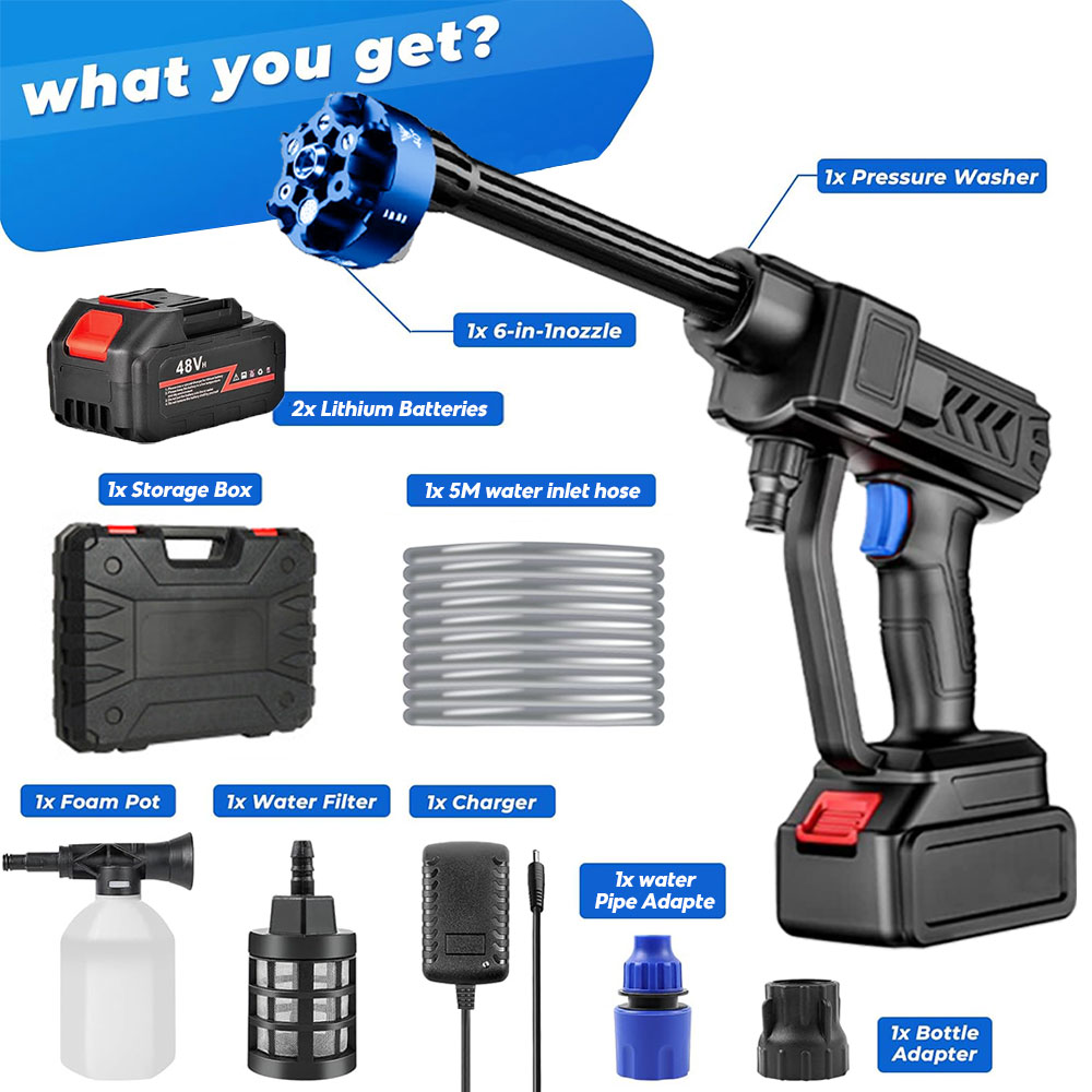 2. Cordless Design: Powered by 12000MHA lithium ion battery, the cordless pressure car washer ensures no restraint of cable, simpler to operate.