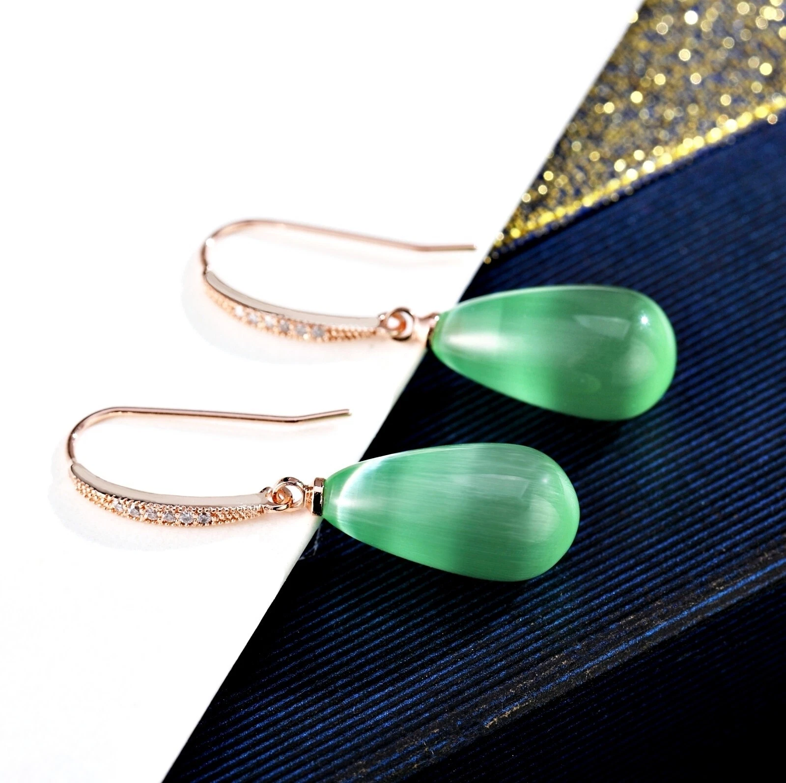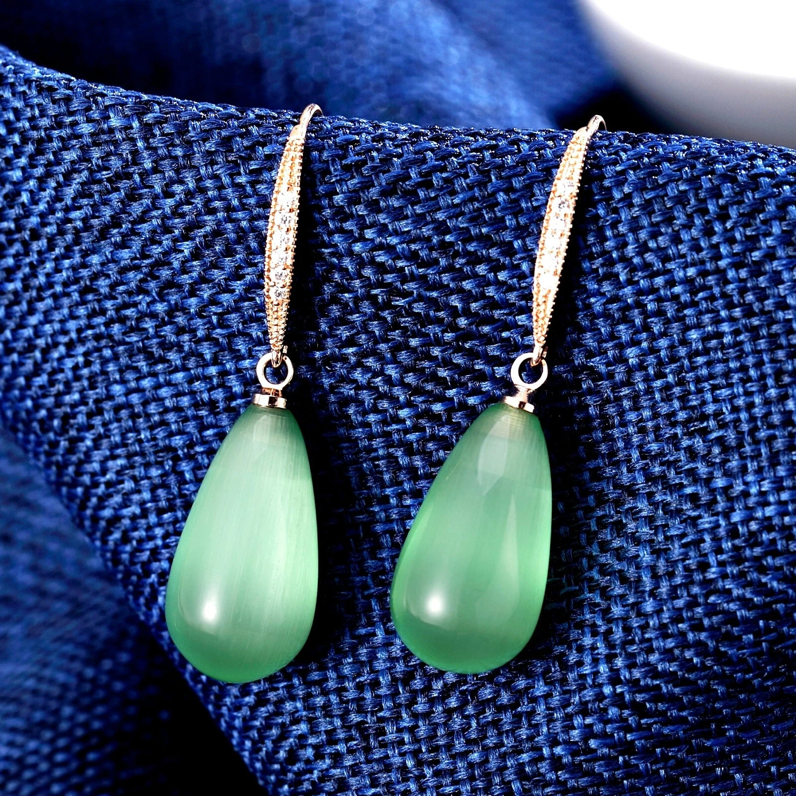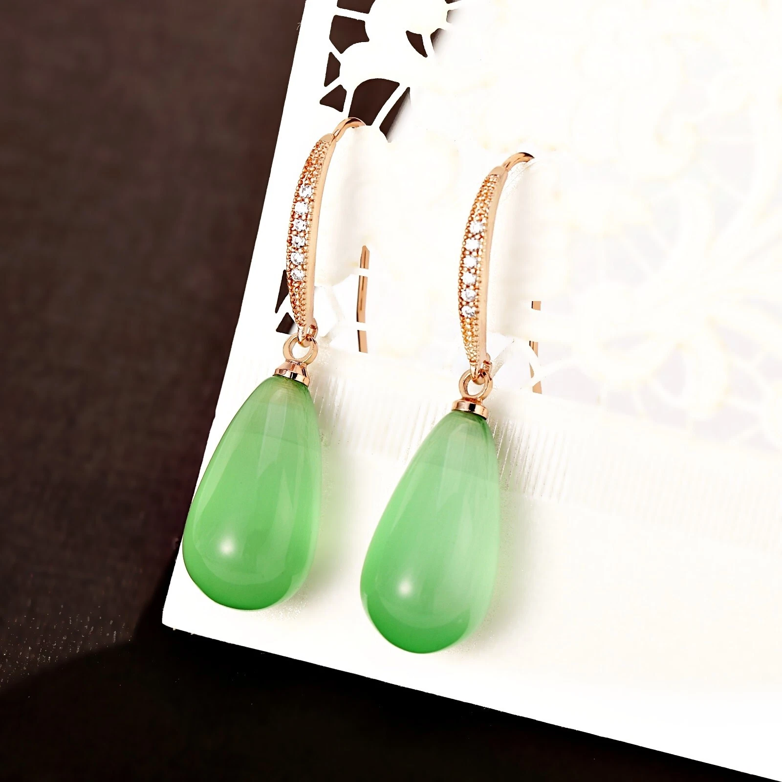 18K Rose Gold Filled Synthetic Jade Green Elegant Long Teardrop Dangle Earrings