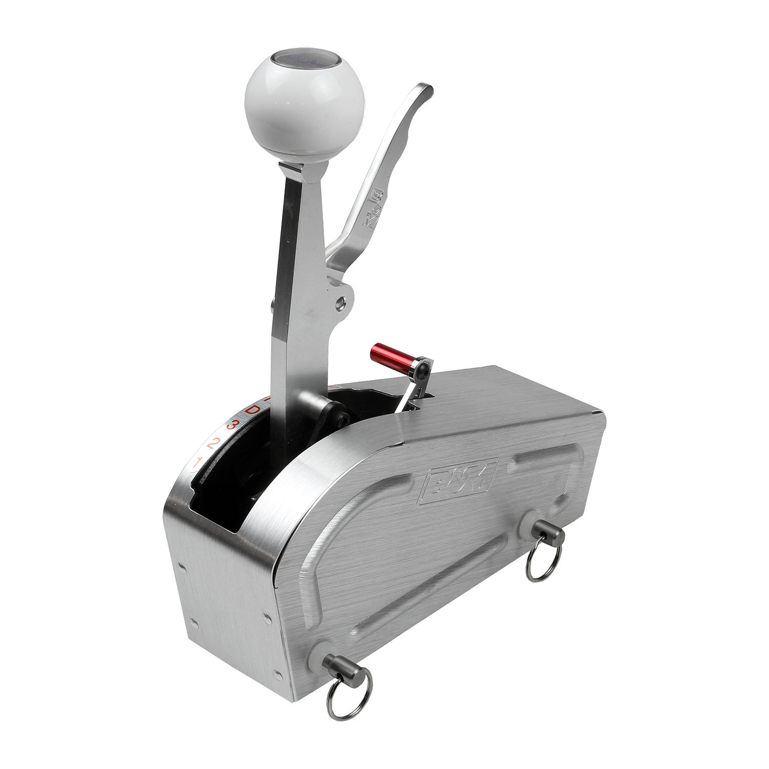 The Original Pro Stick shifter delivers rock-solid performance, mixed with clean design cues and compact size. This is why you see so many Pro Stick shifters at the race track. We start off with a heavy duty steel base with a hardened steel gate plate, a reverse lockout feature that only requires one hand to operate, and complies with NHRA/IHRA safety rules. Then add the billet aluminum shift handle with classic white shift knob, lightweight aluminum trigger and finish it off with a brushed aluminum cover with quick release pins, and you end up with one good looking bullet-proof race shifter. This model Pro Stick comes out of the box ready for action for 1962-73 GM Powerglide transmissions, includes a 5-foot Super Duty shift cable, cable bracket, PG Pro Lever, hardware and detailed instructions for an easy installation. Be sure to check out the optional classic white shift knob with 12-volt momentary switch, or all the other accessories we offer for the Pro Stick in the Shifter Accessories section. Overall Dimensions - 8.25L x 2.92W x 9.25H