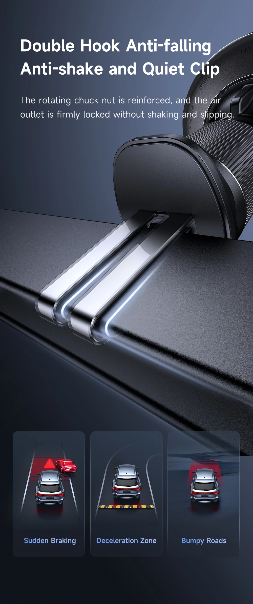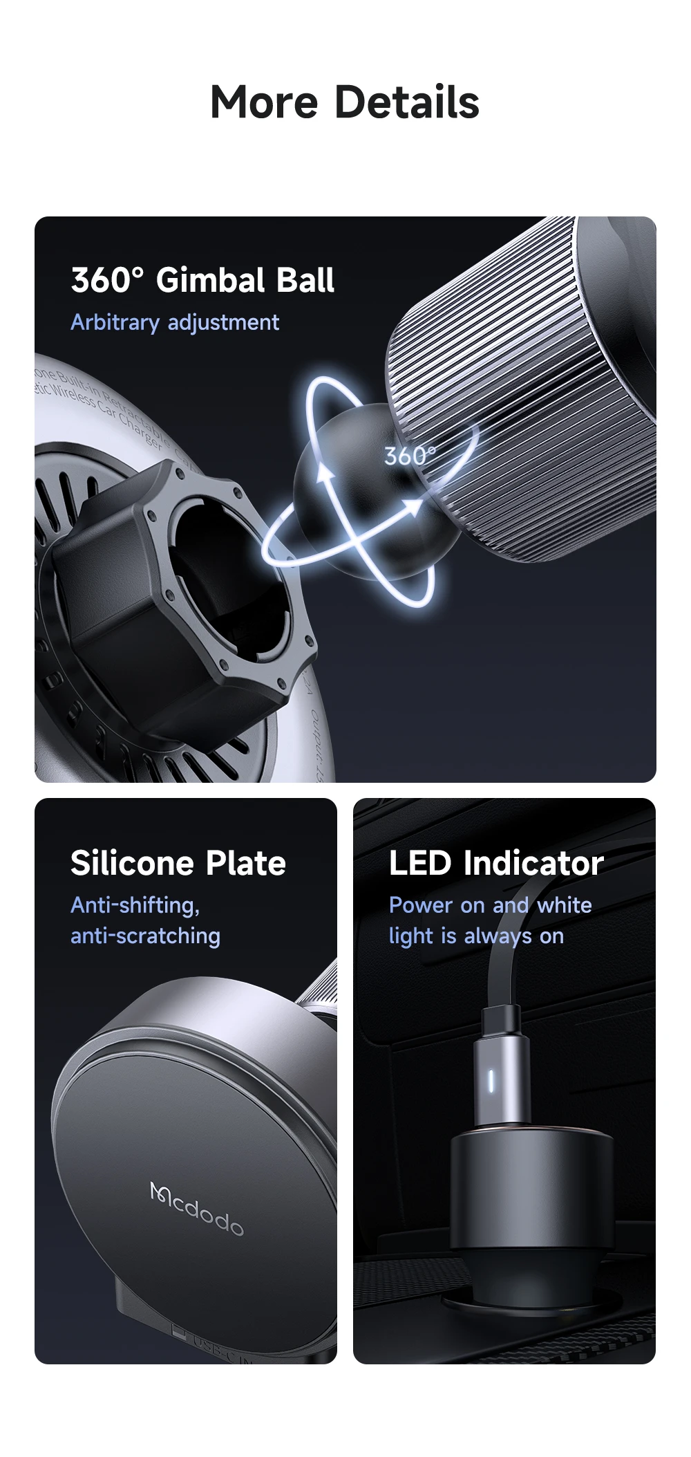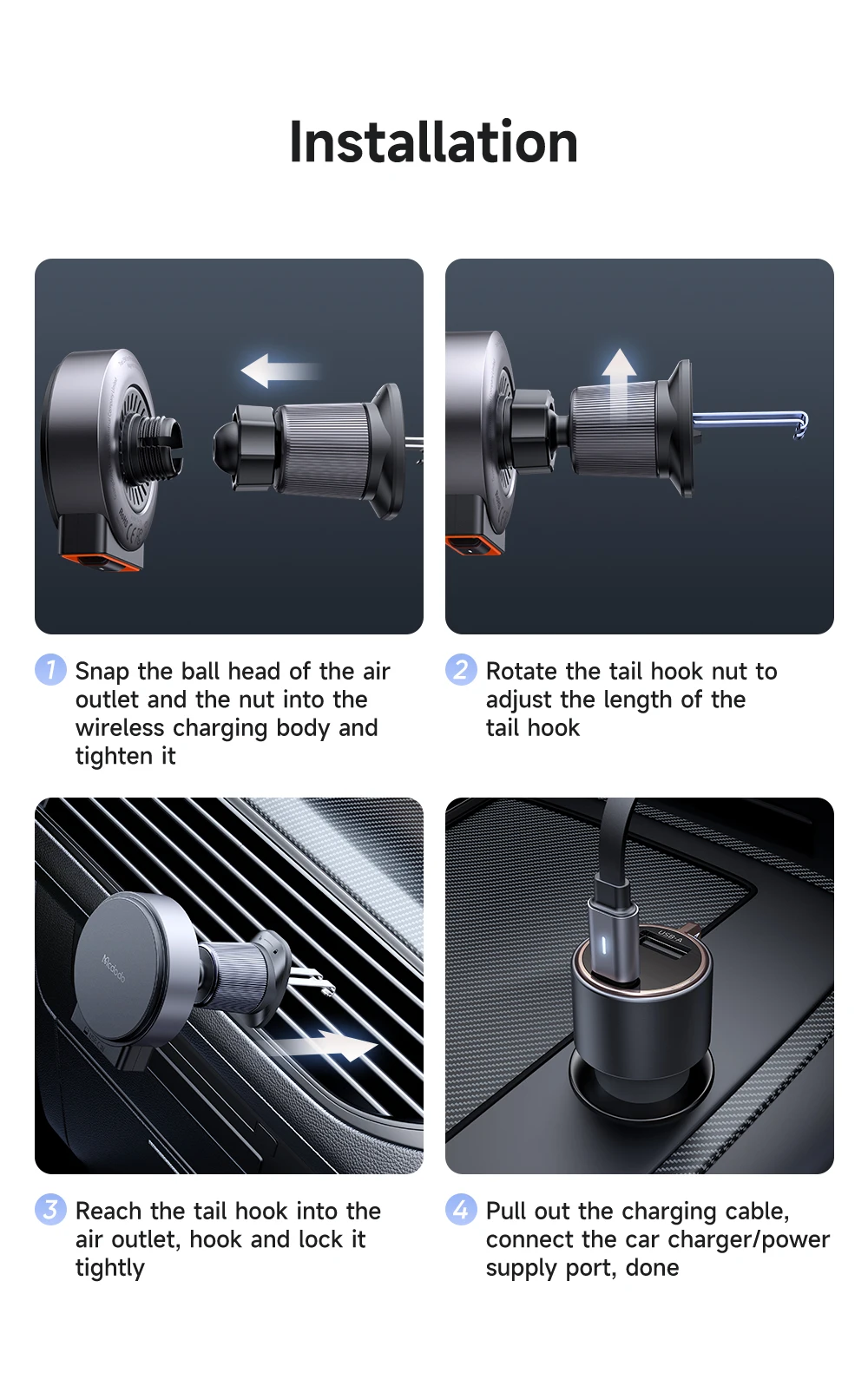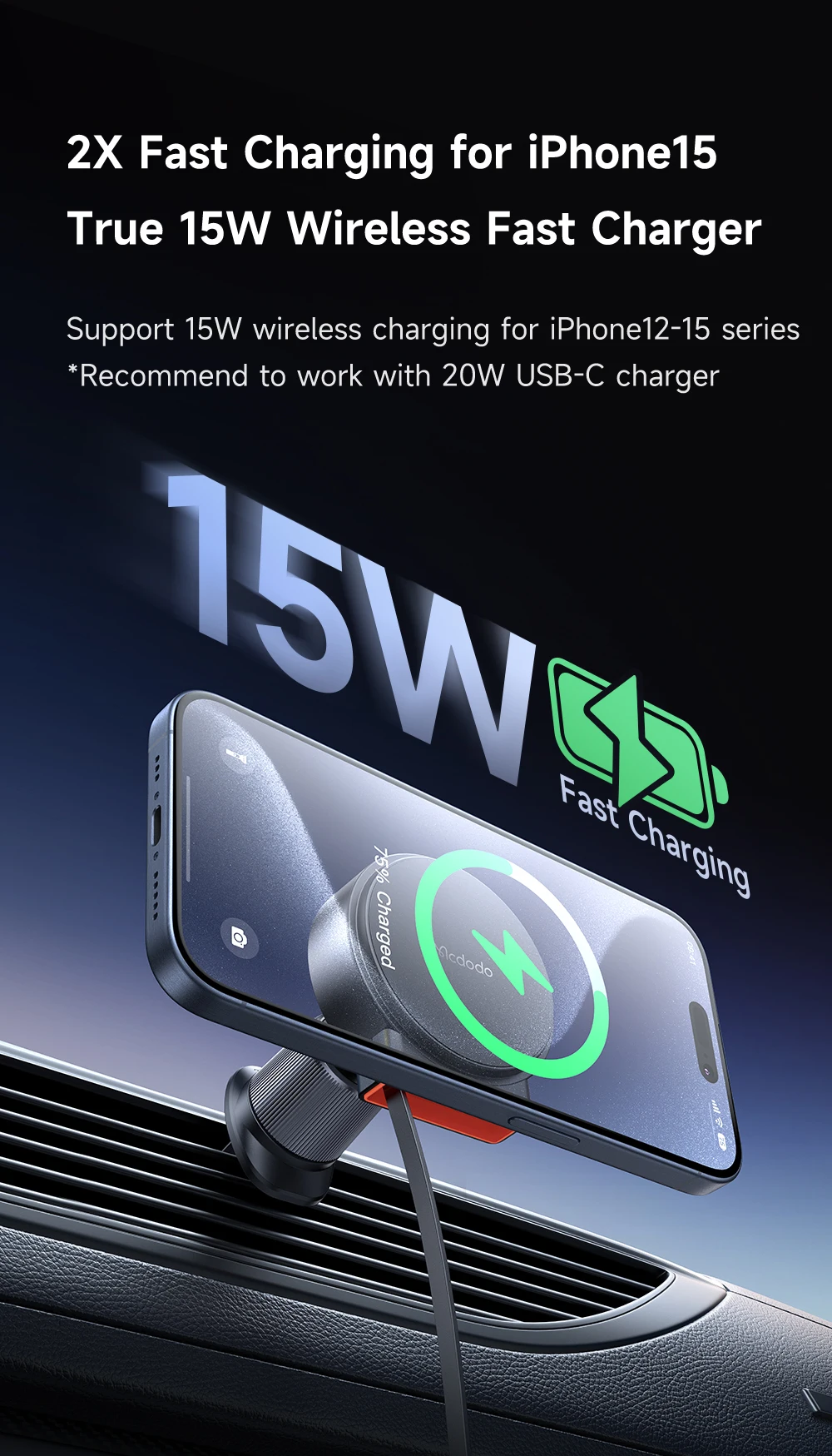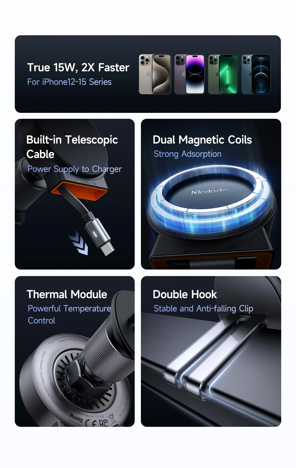 Support | Full Speed 15W for iPhone12-15 series Stable Adsorption ensures that not fall off during driving Tap and Charge Easy to Use Built-in retractable cable, more convenient and concise Double Hook Anti-falling Cli |