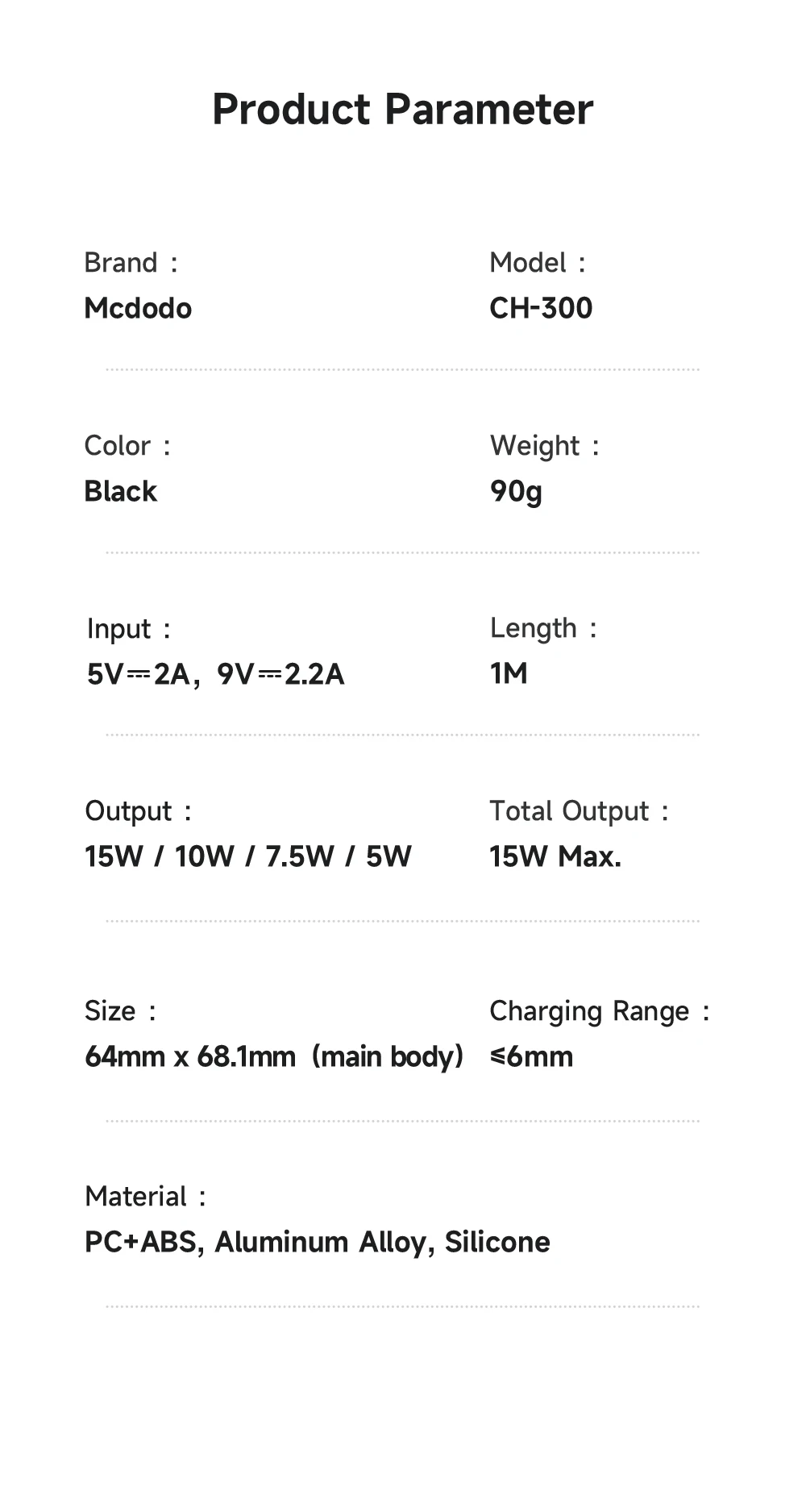 Input & Output | Input:5V⎓2A,9V⎓2.22A Output:15W/ 10W/ 7.5W/ 5W (For iPhone 15W Max.) |