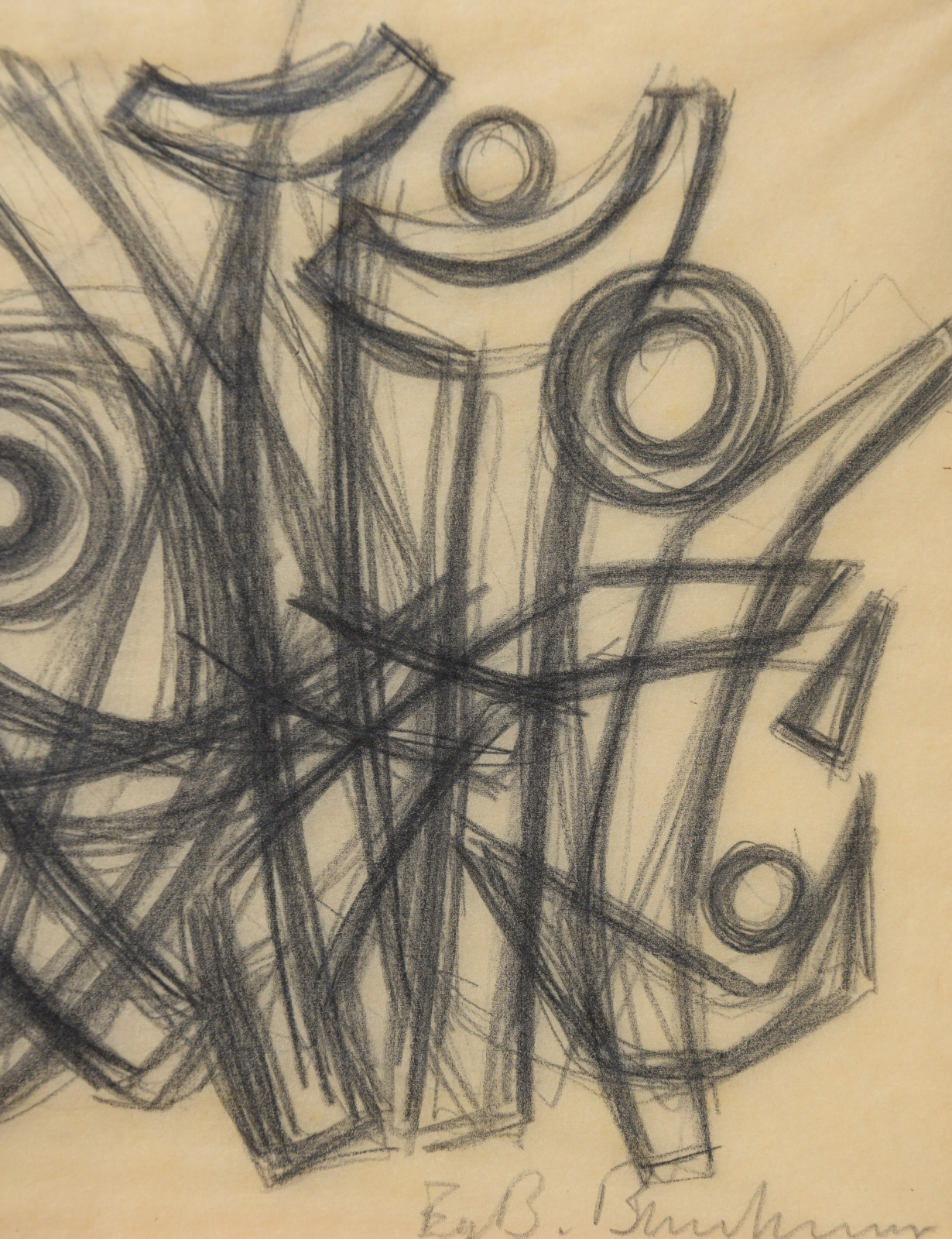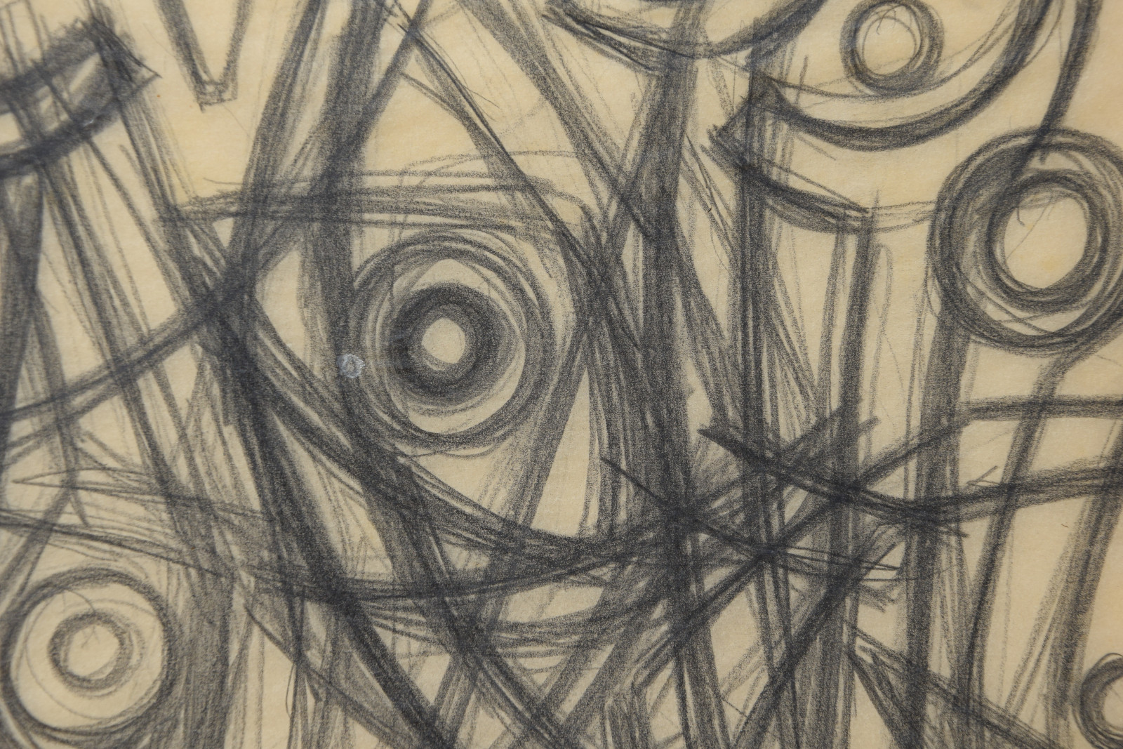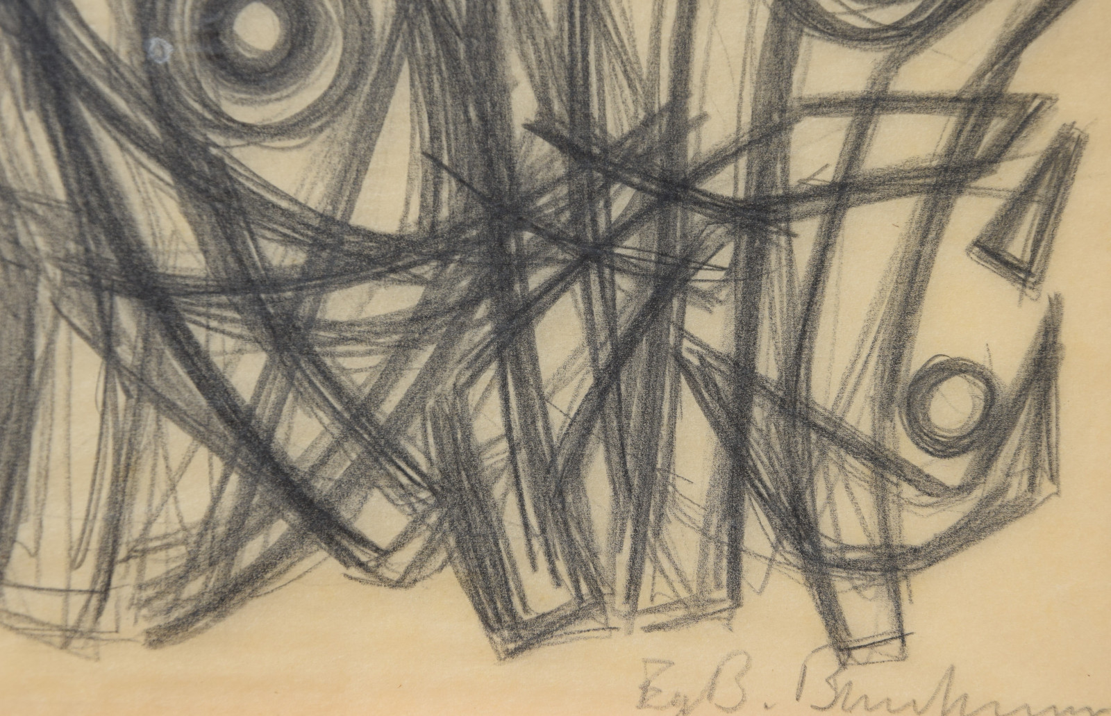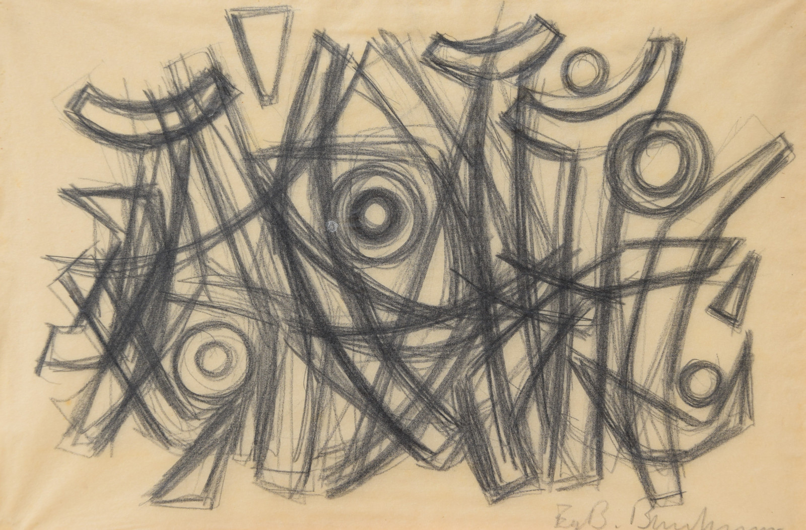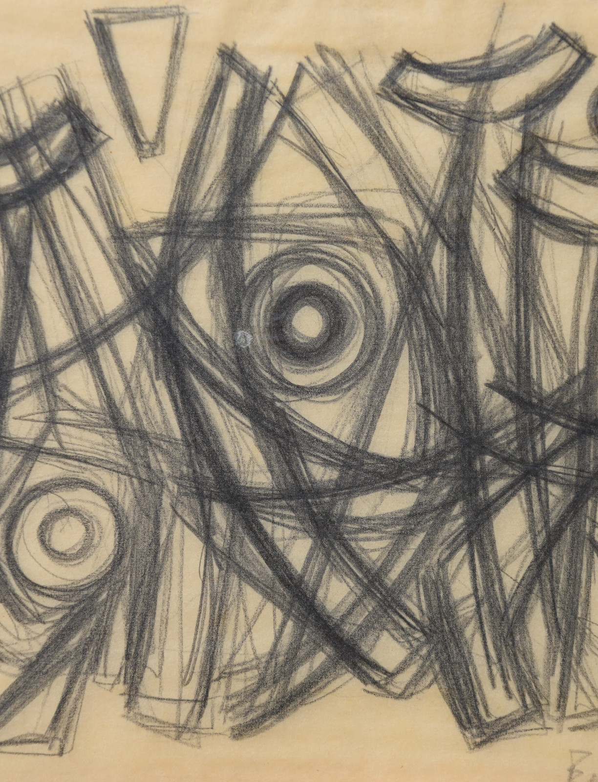 In diesem Querformat zeigt er eine studienhafte Abstraktion mit verschiedenen Formen und Strukturen. Eng aneinanderliegende, teils geschwungene Striche bilden dabei eine Art Gitter oder Netz in welchem dann Kreise aber auch Dreieck eingefügt sind. Die Formen des dichten Netzes scheinen sich dabei den Kreisen und Dreiecken anzupassen, diesen Platz zu machen, um diese nicht zu überlagern.---