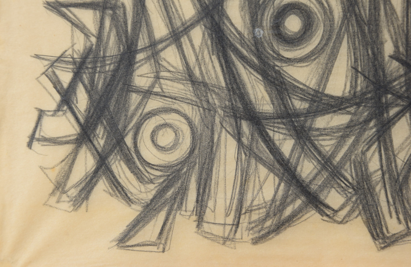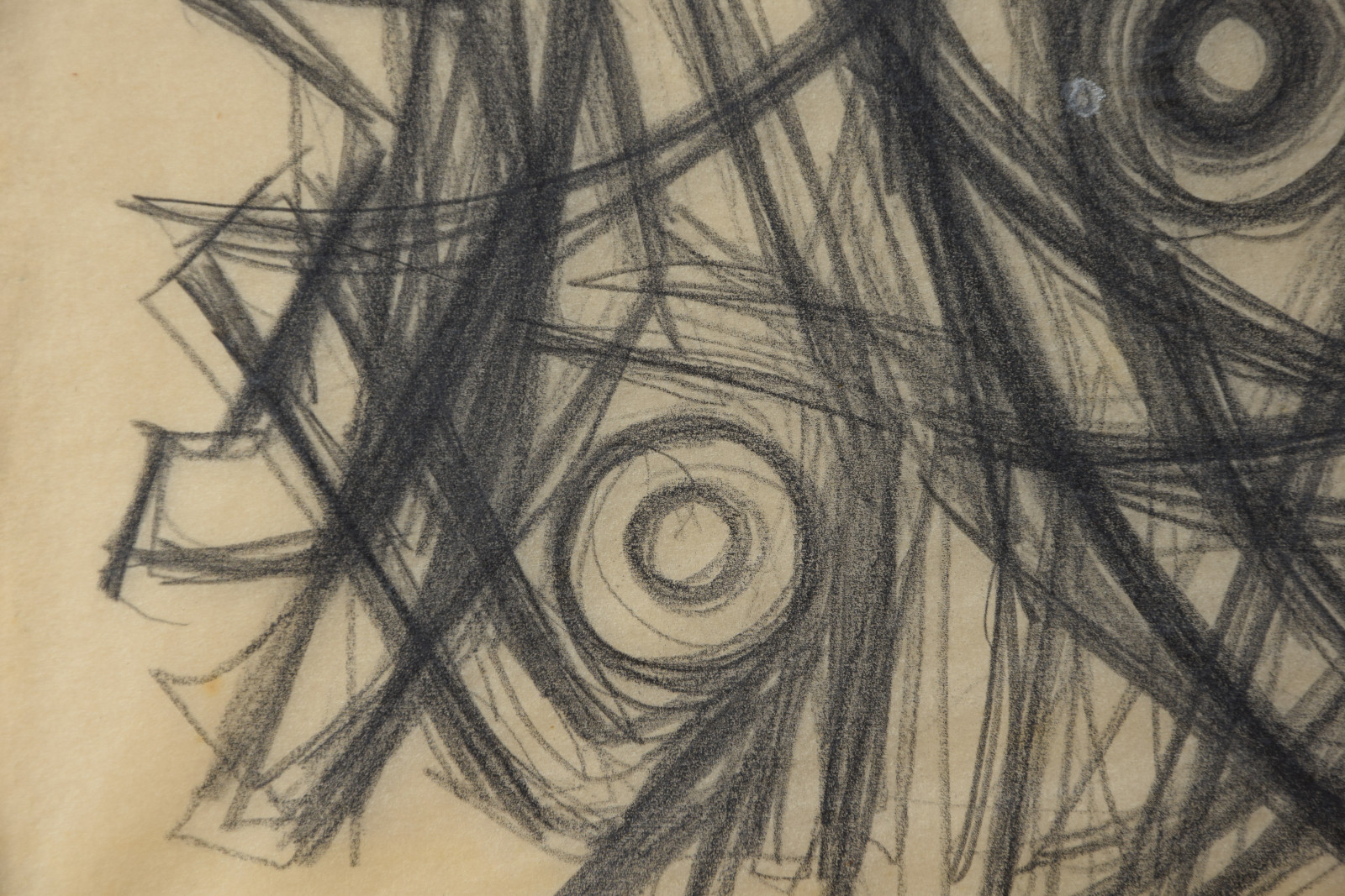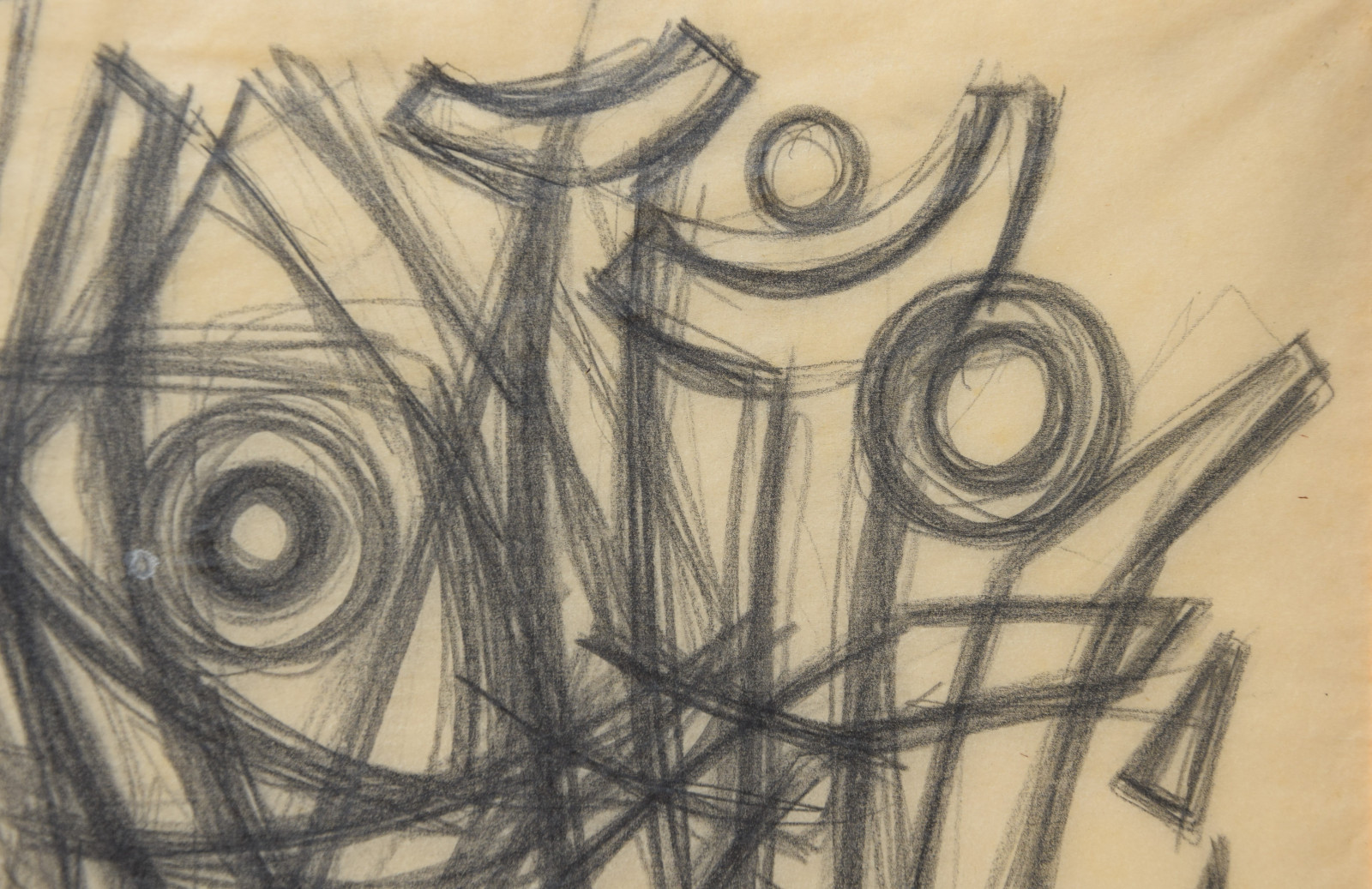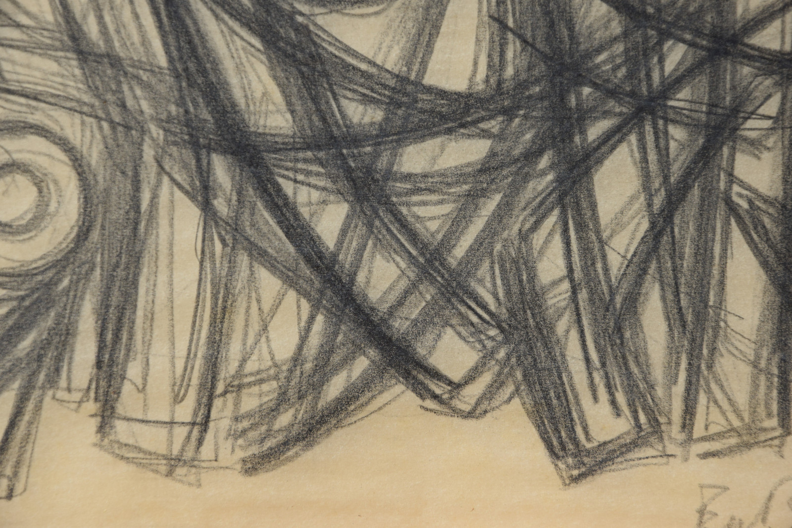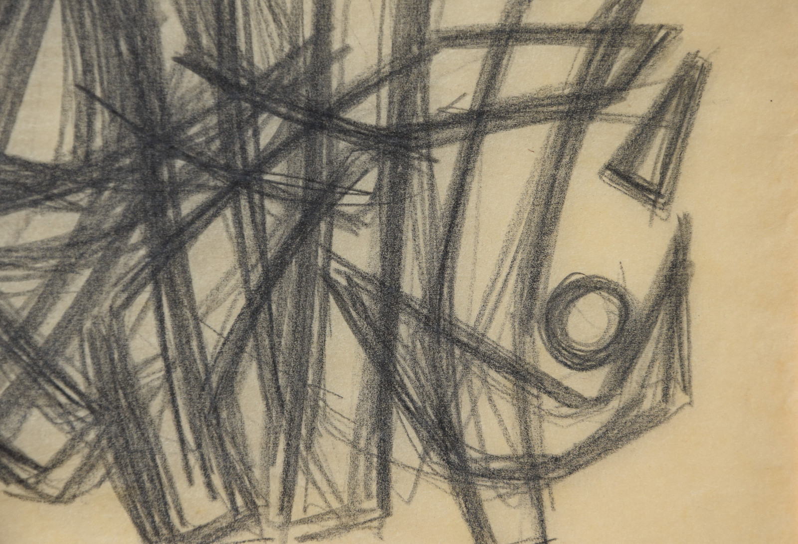 In diesem Querformat zeigt er eine studienhafte Abstraktion mit verschiedenen Formen und Strukturen. Eng aneinanderliegende, teils geschwungene Striche bilden dabei eine Art Gitter oder Netz in welchem dann Kreise aber auch Dreieck eingefügt sind. Die Formen des dichten Netzes scheinen sich dabei den Kreisen und Dreiecken anzupassen, diesen Platz zu machen, um diese nicht zu überlagern.---