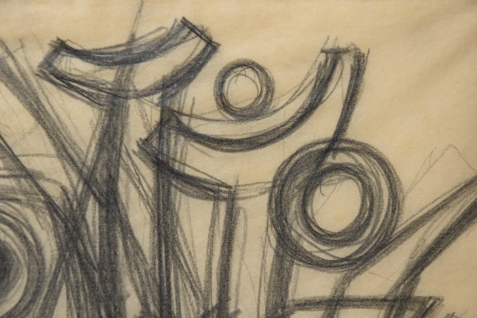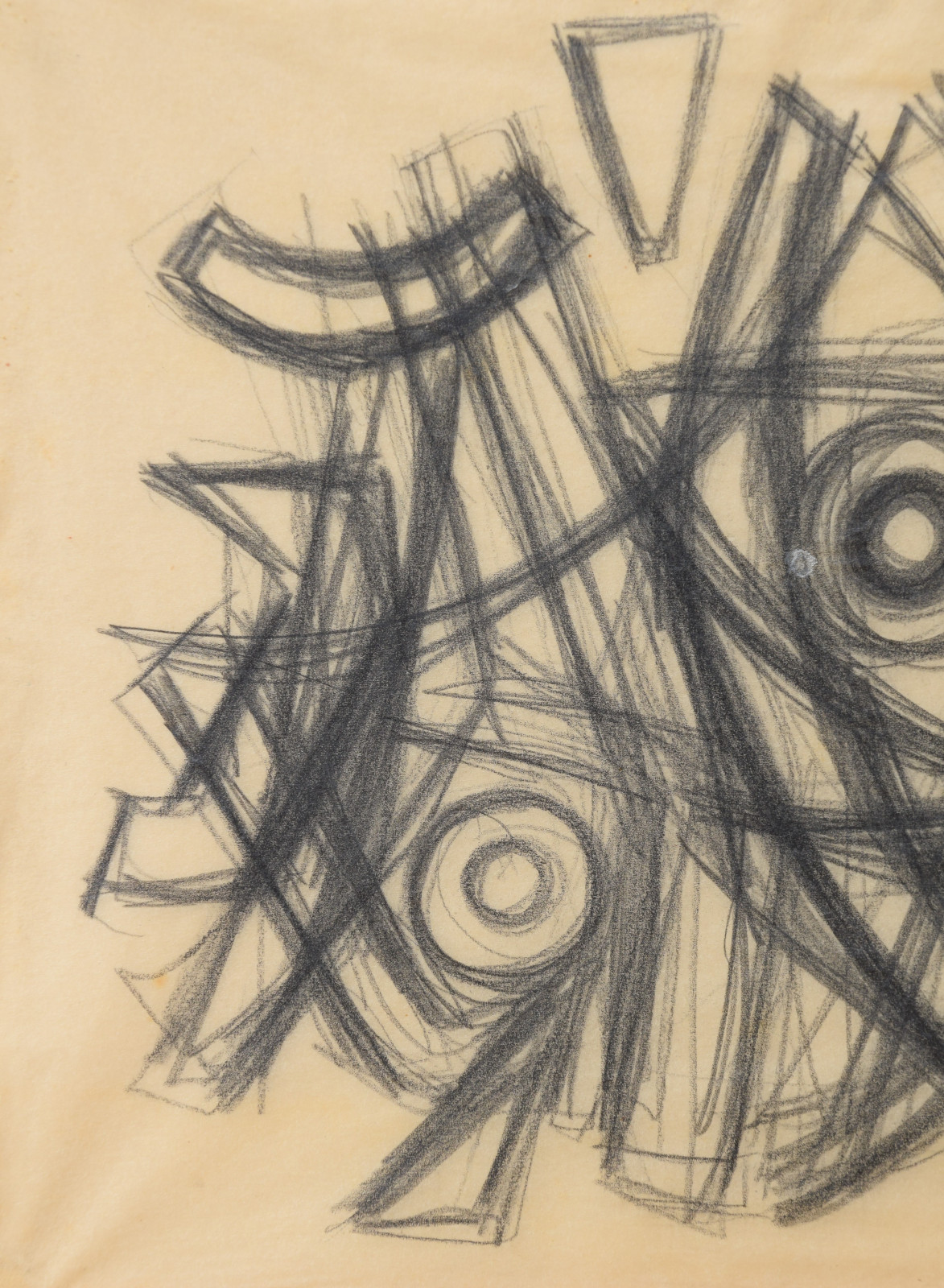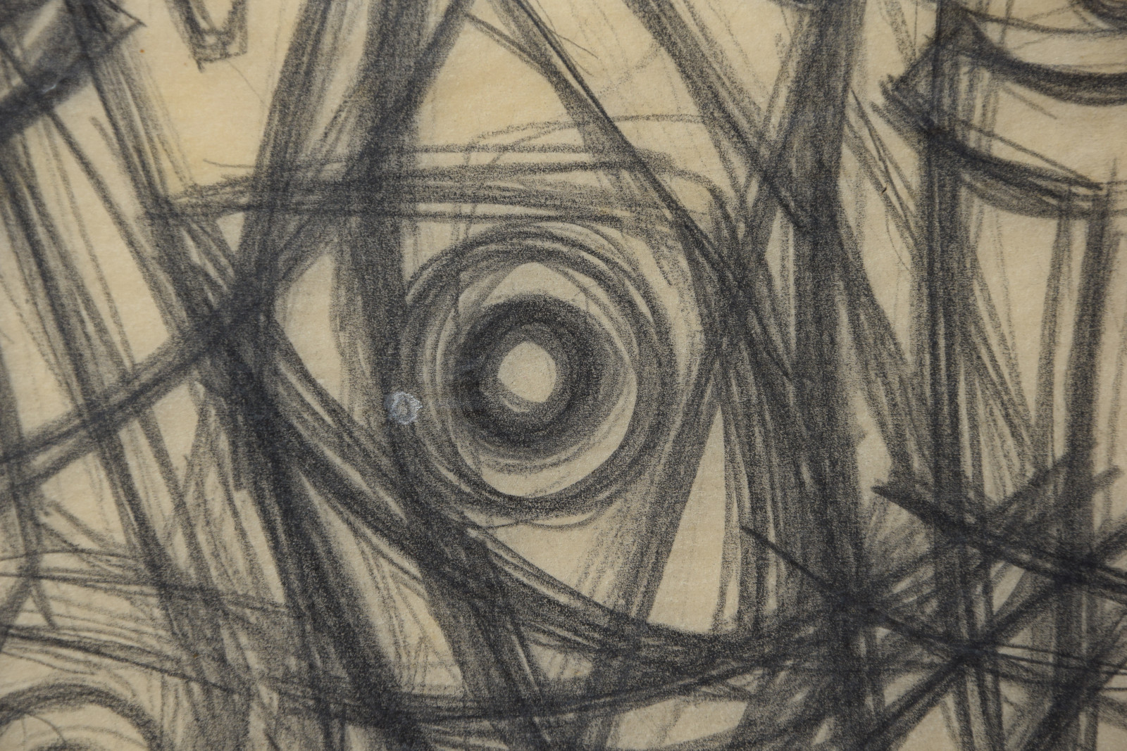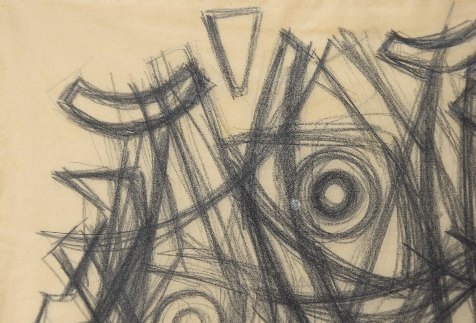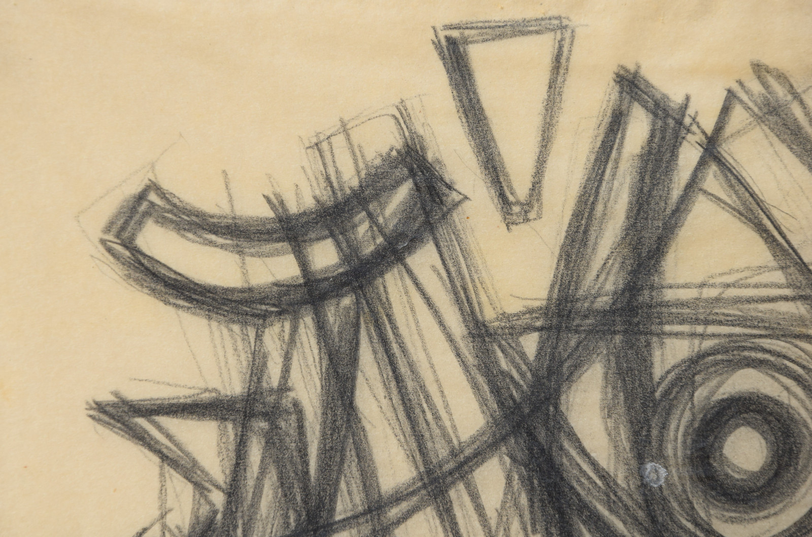 In diesem Querformat zeigt er eine studienhafte Abstraktion mit verschiedenen Formen und Strukturen. Eng aneinanderliegende, teils geschwungene Striche bilden dabei eine Art Gitter oder Netz in welchem dann Kreise aber auch Dreieck eingefügt sind. Die Formen des dichten Netzes scheinen sich dabei den Kreisen und Dreiecken anzupassen, diesen Platz zu machen, um diese nicht zu überlagern.---