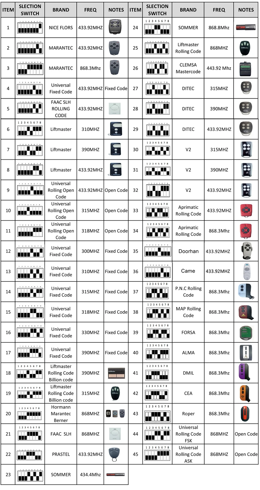 1) Select the correct brand for remote to be programmed by moving dip switches UP or DOWN. For example 433,92Mhz Marantec remote controls, just move Dip-switch 7 UP. 2) Press the learn button. The will LED turn on. 3) Press the button on the remote, the LED flashes 4 times. It means that remote control was programmed successfully. 4) Repeat step 2 for another button. 5)The 2-nd channel programming procedure is the same. Erase all data from the memory card: Press and hold either learn button. The LED will start flash. Keep this button pressed, until the LED will turn off. All saved data in the memory card will be erased permanently and can not be recovered