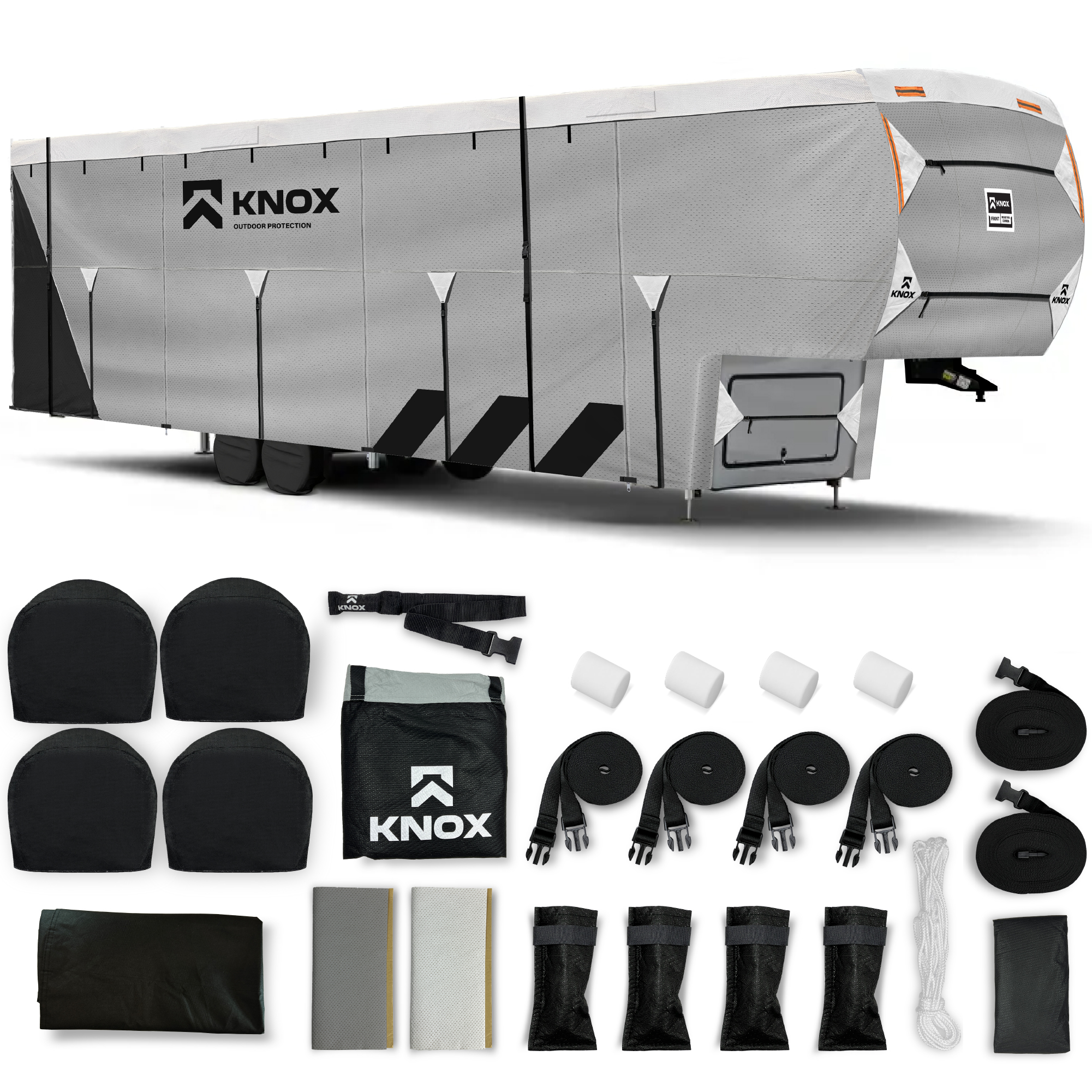 - [ANTI-TEAR PROTECTION, THE CONFIDENCE YOU NEED] - Advanced protection with Knox fifth wheel RV covers. The raised side tension straps, on all our fifth wheel trailer covers, reduce tears by 70%. Upgraded 7-layer reinforced stress points reduced tears by 25%. Our proprietary design and workmanship have proven to reduce billowing, which is a major cause of rips and tears. Crafted from Knox Apex, the sturdiest RV camper cover fabric available. Embrace tear-proof tranquility.