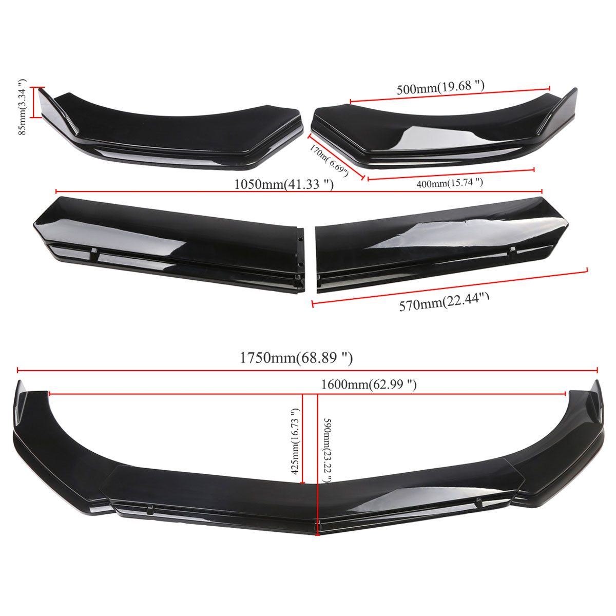 【Universal Front Bumper Lip】This front bumper lip splitter is fit for most models with front bumper size around 1680mm-1900mm. Note: Item model and Compatibility Table are just a reference, take size as a standard. Please note: wrong size for Cadillac ATS 2015 Base Sendan 4-Door wrong size for Cadillac CTS coupe 2011 wrong size for FORD F150 XLT Supercab 2020 wrong size for Mustang EcoBoost Coupe 2-Door 2015 wrong size for Kia Sportage SX Prestige Sport 2024 wrong size for Audi A5 2015 Diesel Coupe 2.0 wrong size for Chevrolet Camaro LT Coupe 2017 wrong size for Nissan Altima 2021 wrong size for BMW E90 M sport 2008 wrong size for Mazda CX5 wrong size for Benz C200 Sports Coupe 2016 Feature: Made of Updated durable and sturdy ABS plastic, adding stiffeners, no deformation in long-term use. More longer and wider than others. Provide an elegant and personalized appearance. Prevent the car from being scraped and improve the level of the decoration of the car. Come with screws, More convenient installation and stable installation. This is a set(4 pieces) front bumper cover lip front spoiler Instruction Not Included, Professional Installation Is Highly Recommended. Specification: Type: Front Bumper Lip Body Kit Spoiler Material: ABS Color: Glossy Black Placement on Vehicle: Front;Lower Package Included: 1 x Set of Front Bumper Cover Lip Front Spoiler(4 Pieces) 1 x Bag of screws