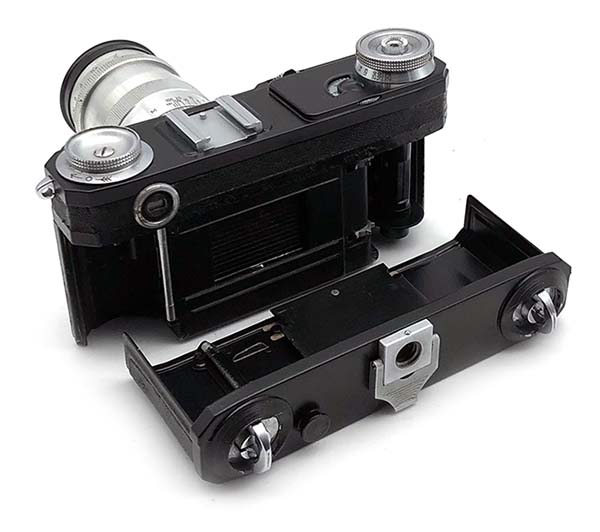 This is a rangefinder camera previously called "Contax". In the brochure of 1960 we can read: "The apparatus...is mainly intended for newspaper photographer's work and skilled amateur photographers". It has the metallic shutter of "jalousie" type, movement of shutters is top-down along the short side of a shot. Exposures are V, 2, 5, 10, 25, 50, 100, 125, 250, 500, 1250. The shutter is equipped with the automatic releaser with speed 9-15 sec. The camera is completed with the telephoto lens "Jupiter 11". Both simplex and double-cylinder cassettes can be used.