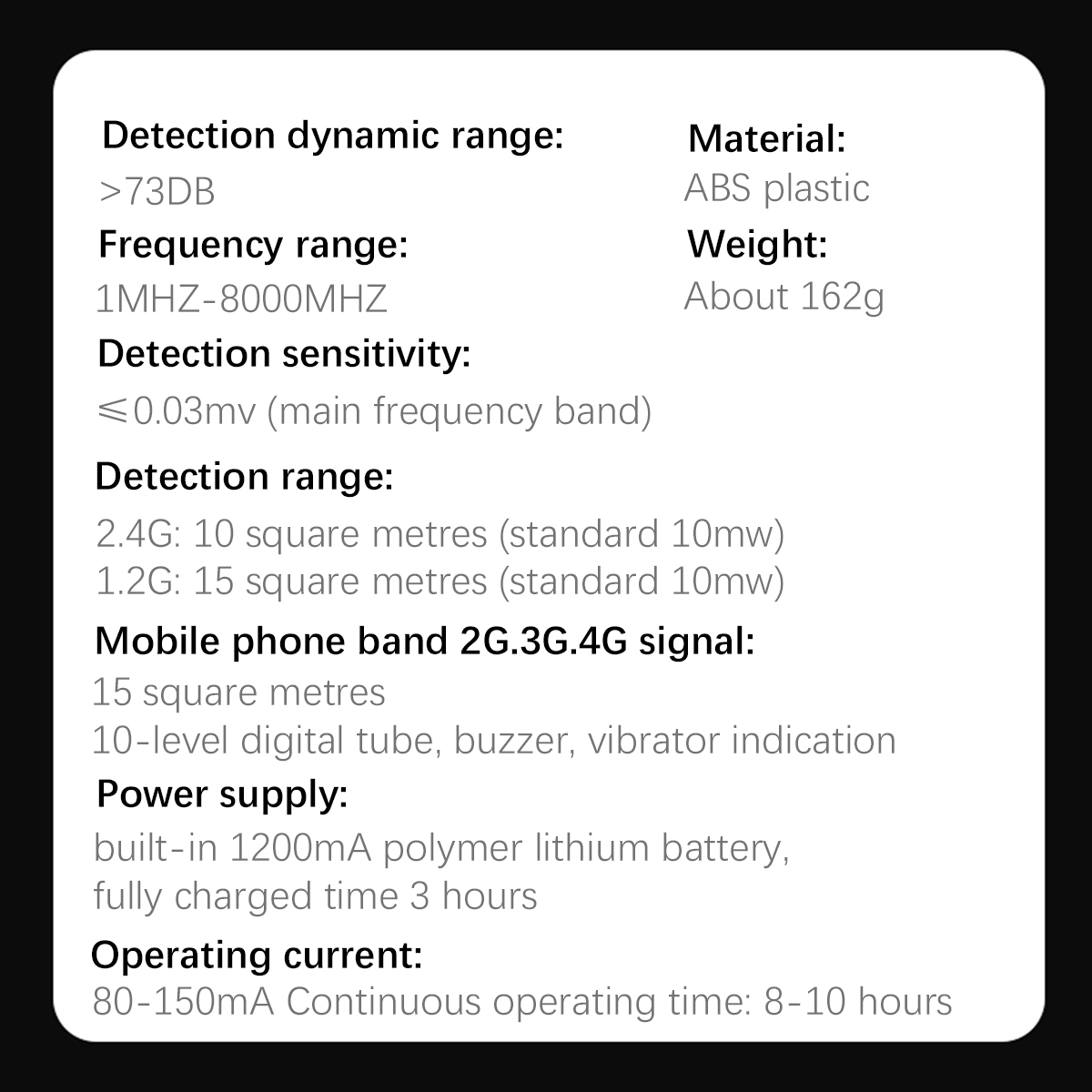 ★ Detection of sneak shots, eavesdropping, positioning, infrared scanning, strong magnetic positioning, infrared lamp bead scanning, high-frequency signal detection, etc.