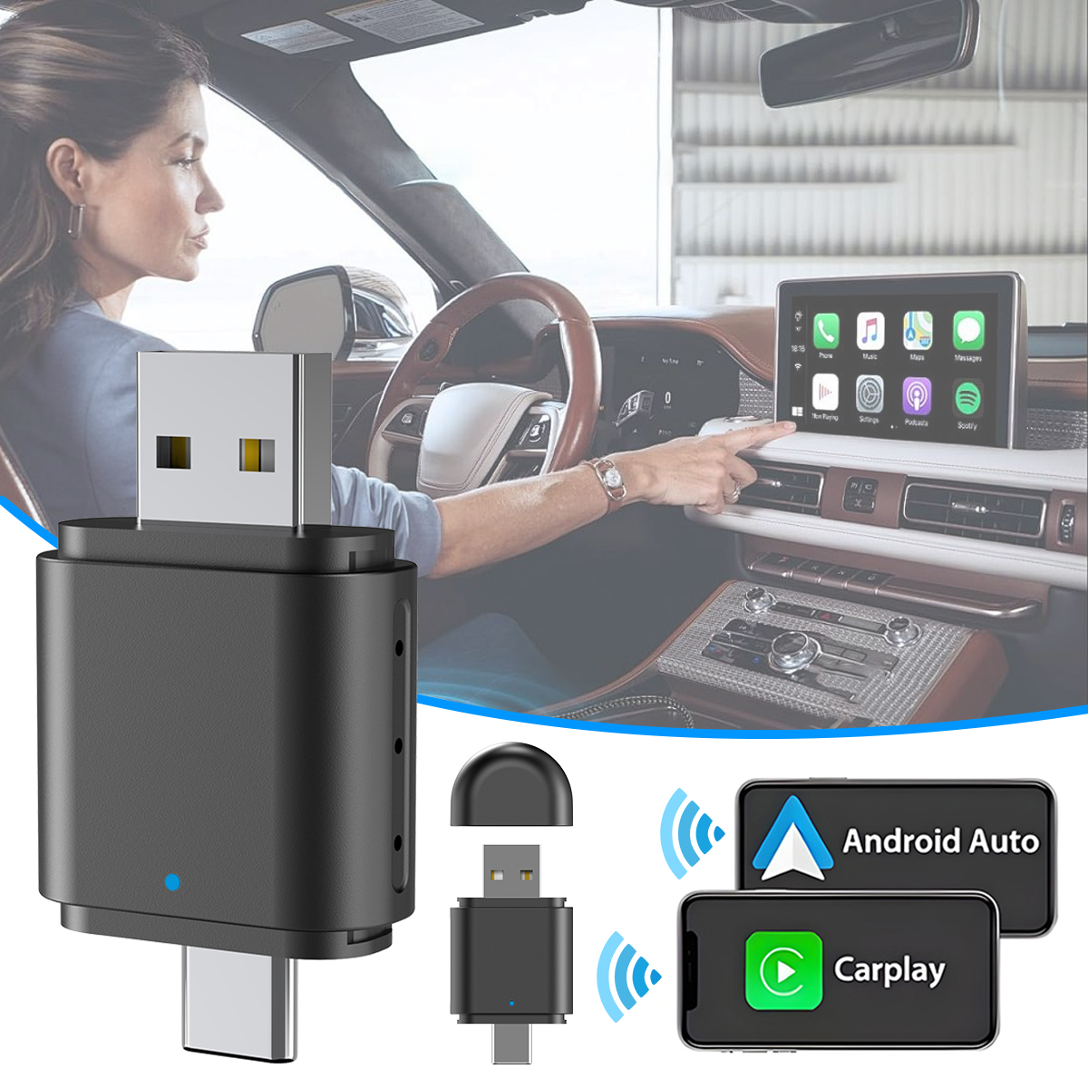 2. Connect th wireless adapter to he USB-A or USB-C port in your car. Make sure you plug the adapter into the port intended for wired Apple Carplay or Android Auto.