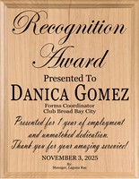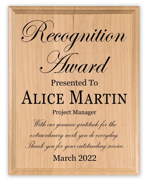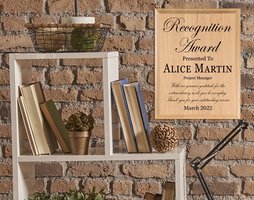 Show your appreciation with a timeless Personalized Recognition Award Plaque. Whether you’re celebrating an employee’s commitment, project leadership, or professional impact, this solid maple wood plaque is an elegant and lasting expression of gratitude. Customize it with your honoree’s name, title, message, and date.