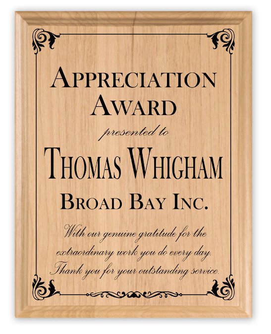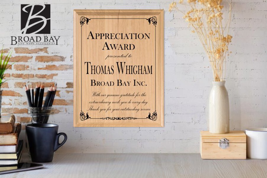 Because great work deserves more than a thank you. This personalized Appreciation Award plaque is handcrafted from solid maple wood and custom printed with the recipient’s name, title, and your message — a professional, lasting tribute to dedication and excellence.