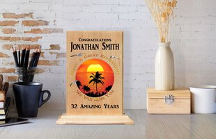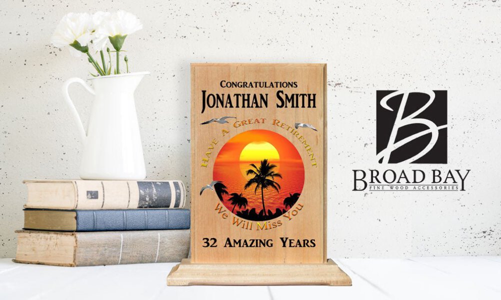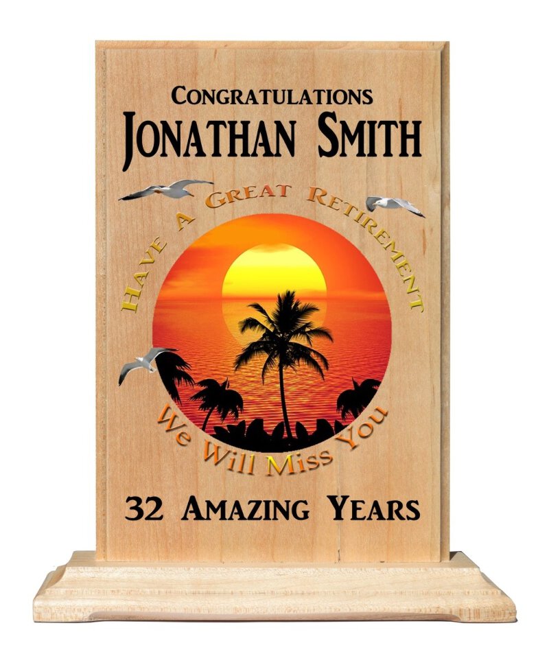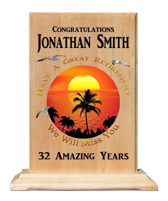 Personalized happy retirement gift plaque, custom printed with the retiree's name on solid wood. Handcrafted daily in Virginia Beach, USA. A meaningful retirement keepsake or office farewell gift for any man or woman.