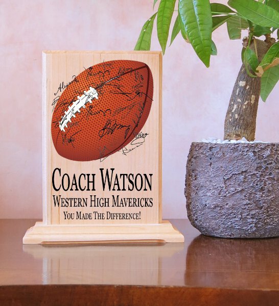 Personalized coach gift plaque, custom printed on solid wood with a signable surface for the whole team. Works for basketball, football, soccer, softball, volleyball, and more. Handcrafted daily in Virginia Beach, USA. A meaningful end-of-season or appreciation gift for any coach.
