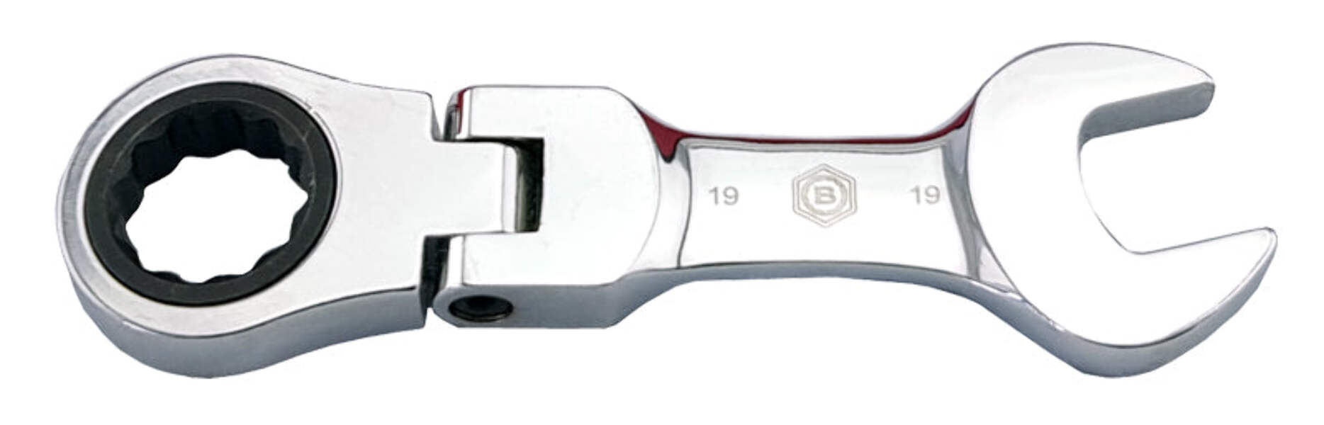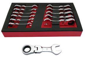 This Britool Hallmark ratchet spanner set is designed for versatility and precision in tight spaces. Featuring a small head profile and stubby design, these wrenches are perfect for use in confined areas, such as modern car engines. The ratchet ring pivots 180 degrees, enhancing access, while the 72-tooth ratchet mechanism requires just 5 degrees of movement to turn a fastener, compared to the 30-degree sweep needed by standard wrenches.