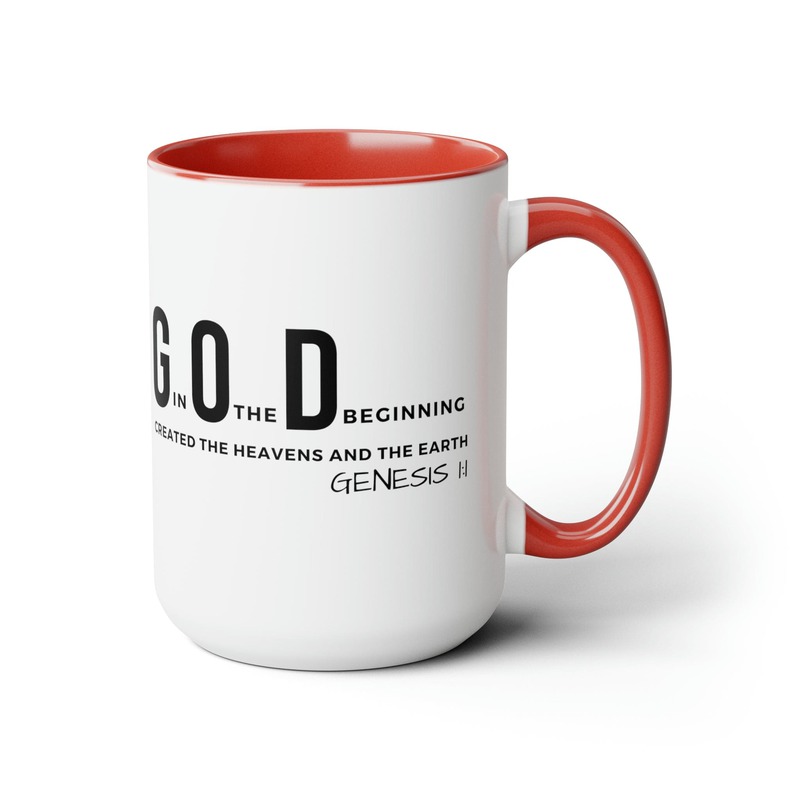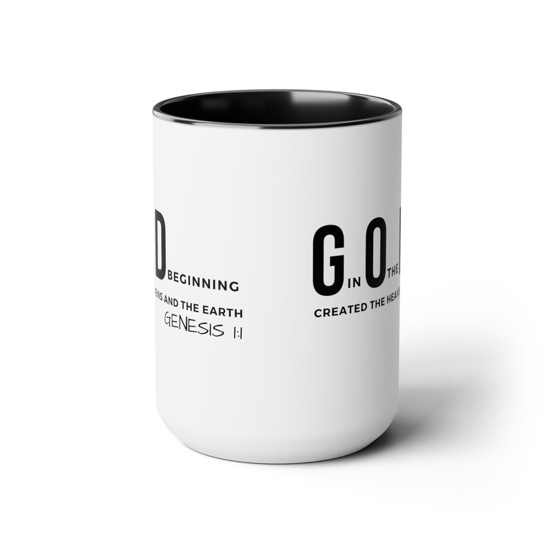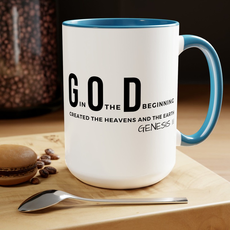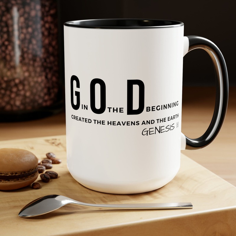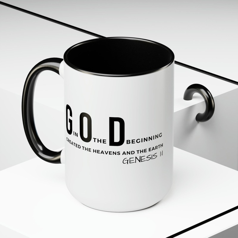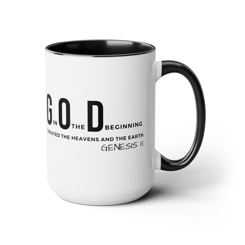 Accent Ceramic Mug 15oz God In The Beginning Print. This two-tone accent ceramic coffee mug is perfect for your morning cup of coffee, tea, hot cocoa, or any other hot beverage. It's also great for cold beverages! The ceramic mug is microwave and dishwasher safe. It’s BPA and Lead-free, and made of durable ceramic in 15-ounce size. Decorative mugs can be uséd for a variety of purposes. They make great gifts for friends and family, and they are also perfect for adding a personal touch to your own home. Whether you use them to hold your morning coffee or tea, or simply to display on your shelf as a decoration, decorative mugs are a great way to show your personality.