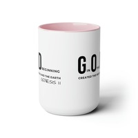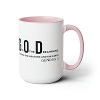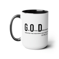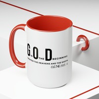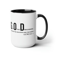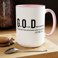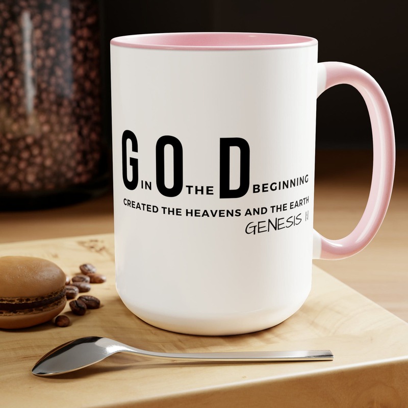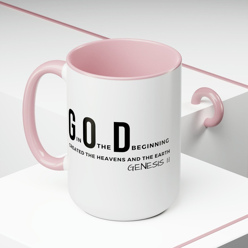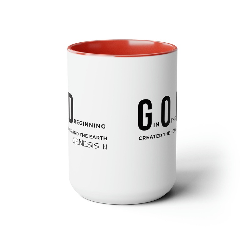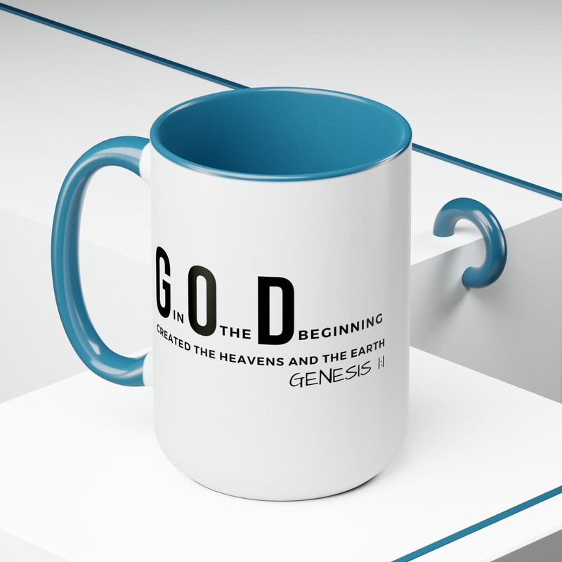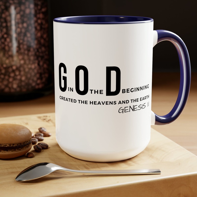 Accent Ceramic Mug 15oz God In The Beginning Print. This two-tone accent ceramic coffee mug is perfect for your morning cup of coffee, tea, hot cocoa, or any other hot beverage. It's also great for cold beverages! The ceramic mug is microwave and dishwasher safe. It’s BPA and Lead-free, and made of durable ceramic in 15-ounce size. Decorative mugs can be uséd for a variety of purposes. They make great gifts for friends and family, and they are also perfect for adding a personal touch to your own home. Whether you use them to hold your morning coffee or tea, or simply to display on your shelf as a decoration, decorative mugs are a great way to show your personality.