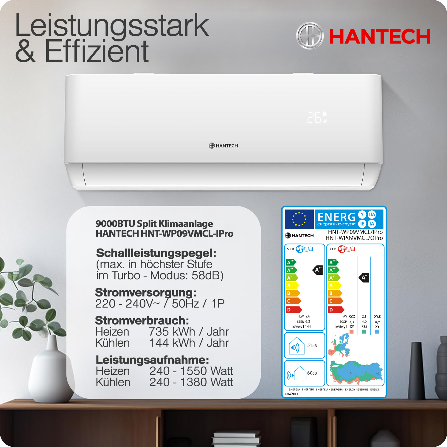 HANTECH Split-Klimaanlage 9000 BTU: Top-Markenprodukt mit hochwertiger Invertertechnik, R32-Kältemittel und umweltfreundlichen Funktionen für ein angenehmes Raumklima.