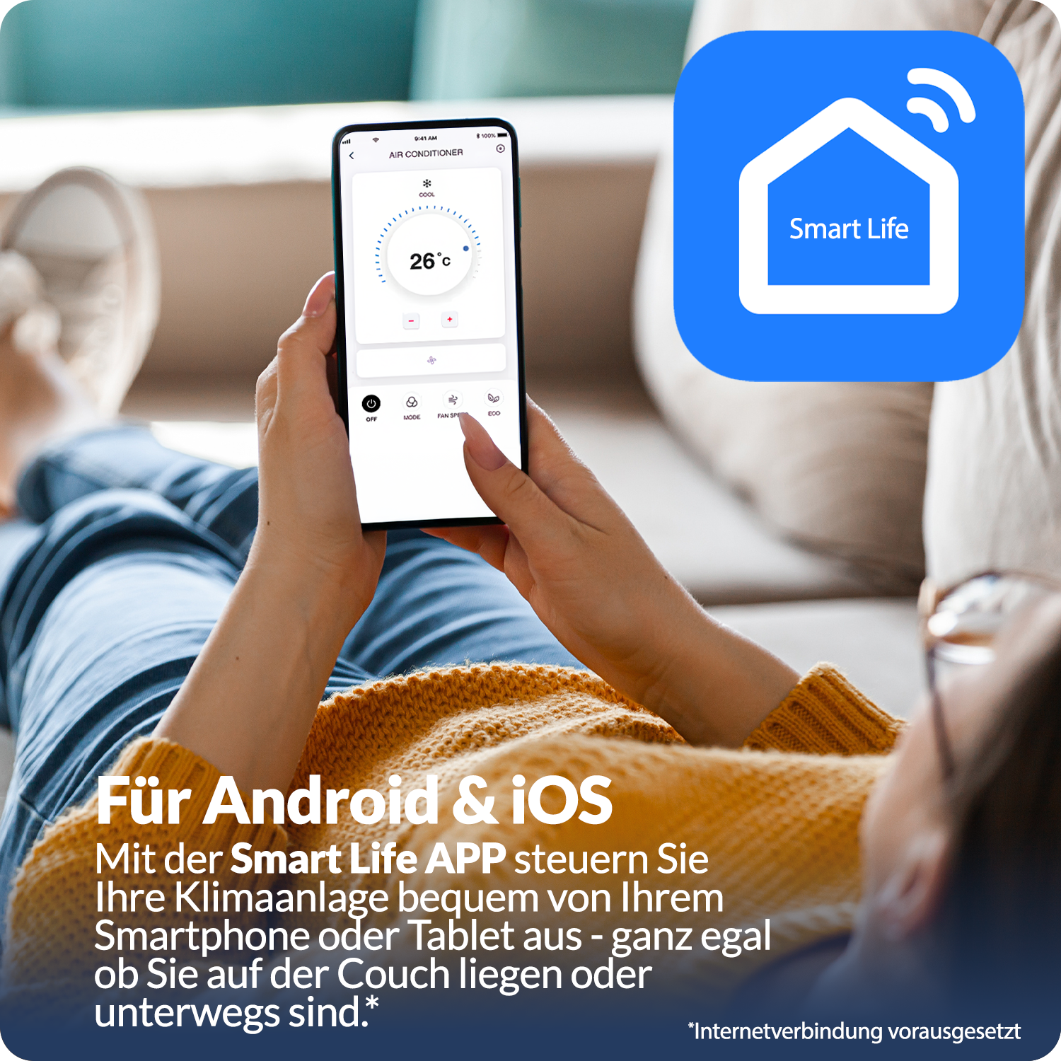 Bequem von unterwegs das Klimagerät mit allen vorhandenen Funktionen und Einstellungen bedienen. So können Sie zum Beispiel einige Minuten vor Ankuft, die Räumlichkeiten vorkühlen, um in einen angenehm temperierten Raum anzukommen. Die Steuerung, neben der Infrarot-Fernbedienung, ist auch über das heimische W-Lan Netzwerk ohne Internetnutzung möglich.