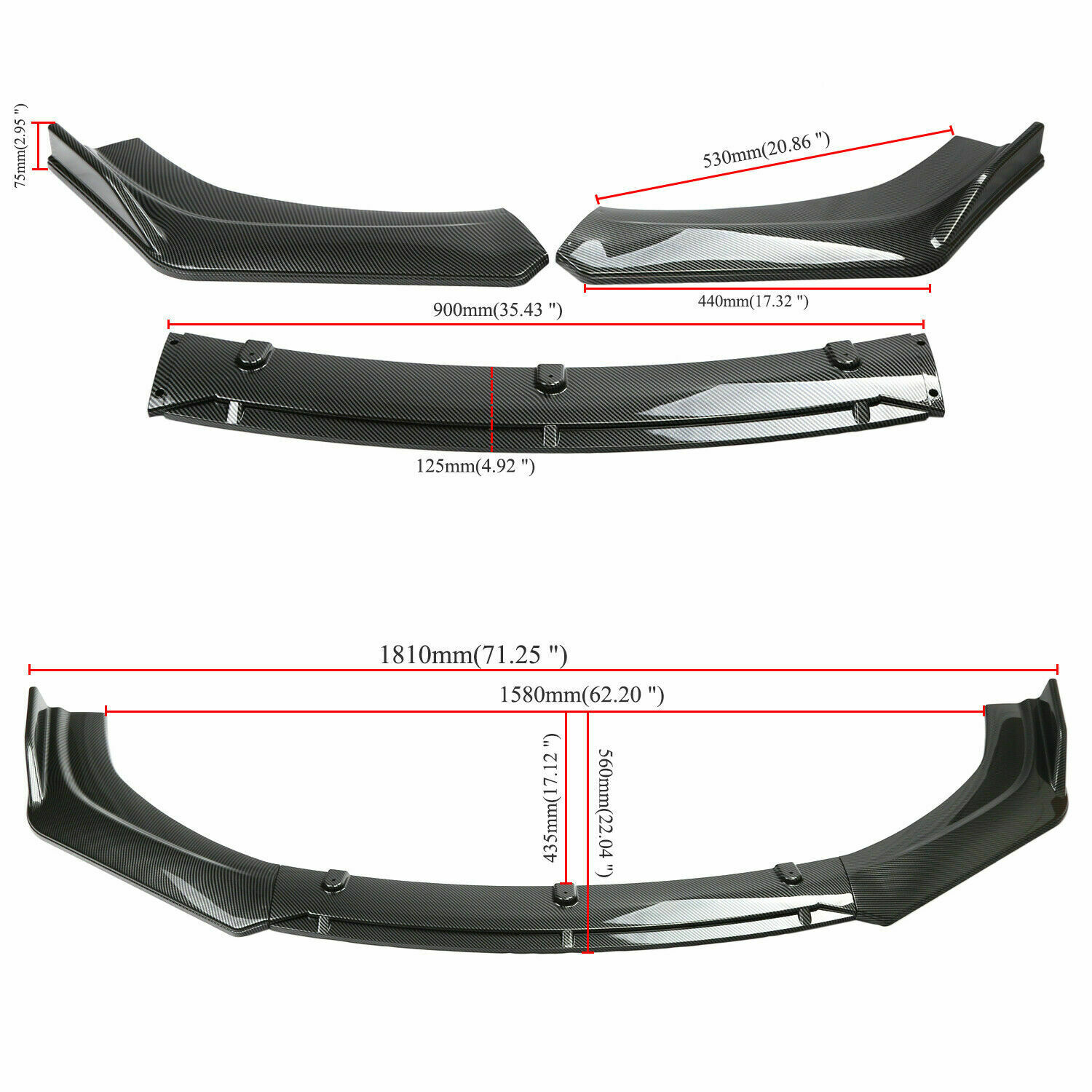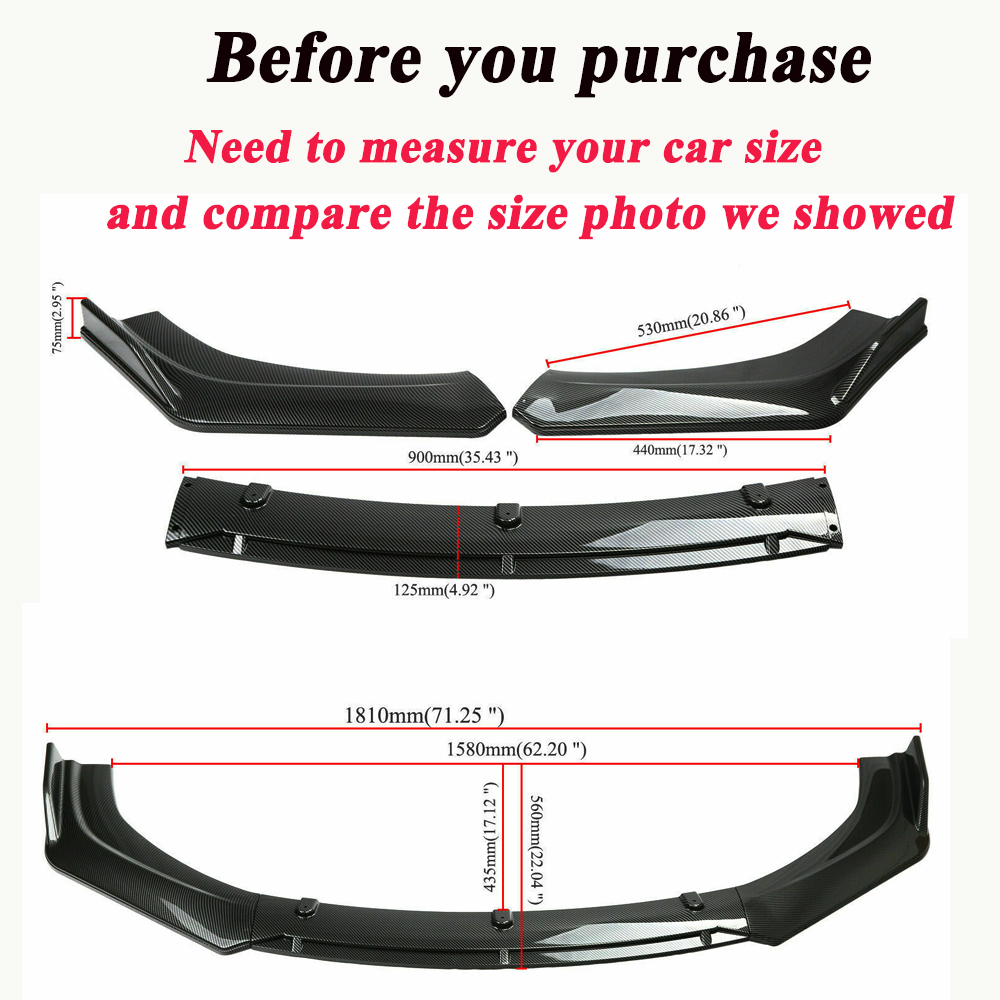 The item is Universal Size,Please Ensure This Part Fits For Your car Model and check the size Before you buy.Thanks for your understanding. Note: Item model and Compatibility Table are just a reference, take size as a standard. Note: Not for Audi Quattro Not for Audi A7 RS7 2014 Not for Audi RS4 quattro (too big for this models) Not for Audi S6 Base Sedan 4-Door 2013 Not for INFINITI G37 Sport Coupe 2009 Not for INFINITI G37 2013(a little big for this models) Not for INFINITI q50 base 2018 Not for Toyota Corolla LE Sedan 2018 Not for Subaru WRX STI 2017 Not for jeep SRT 2014 Not for Lexus IS250 Base Sedan 4-Door 2006 2008 (too big for this model) Not for VW golf mk7 1.6tdi 2013 Not for VW Golf GTI MK7.5 2019 (a little Big) Not for VW golf mk7 tdi 2014 (too big for this model) Not for VW GTI mk7 2016 Not for Benz A class 2013 Not for Benz C-Class Diesel Saloon 2014 2016 Not for Cadillac CTS Base Coupe 2013 (too big for this model) Not for BMW 1 Series F20/F21 (too big for this models) Not for BMW 740i Sedan 4-Door 2016 Not for seat leon cupra 2019 Not for Peugeot 308 gt 2015 (too big for this models) Not for Honda Accord 2023 Not for Suburu liberry 2005 Not for Peugeot 208 GT Line all models Not for Toyota Corolla LE SE MODELS (it's too small to fit LE and SE) Feature: Made of Updated durable and sturdy ABS plastic, adding stiffeners, no deformation in long-term use. More longer and wider than others. Provide an elegant and personalized appearance. Prevent the car from being scraped and improve the level of the decoration of the car. Come with screws, More convenient installation and stable installation. This is a set(3 pieces) front bumper cover lip front spoiler Instruction Not Included, Professional Installation Is Highly Recommended. Specification: Type:Front Bumper Lip Body Kit Spoiler Material:ABS Color: Carbon Fiber Placement on Vehicle: Front;Lower Package Included: 1 x Set Of Front Bumper Cover Lip Front Spoiler(3 Pieces) 1 x Bag Of screws